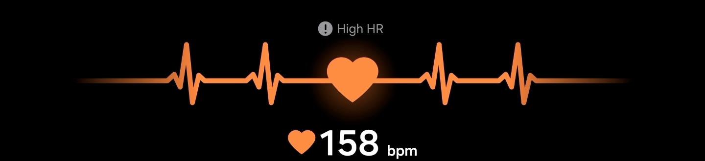 GUI of ECG being measured can be seen with the bpm changing. Above the measurement is a moving graph illustrating the heartbeat and a text of 'High HR' with a warning sign.