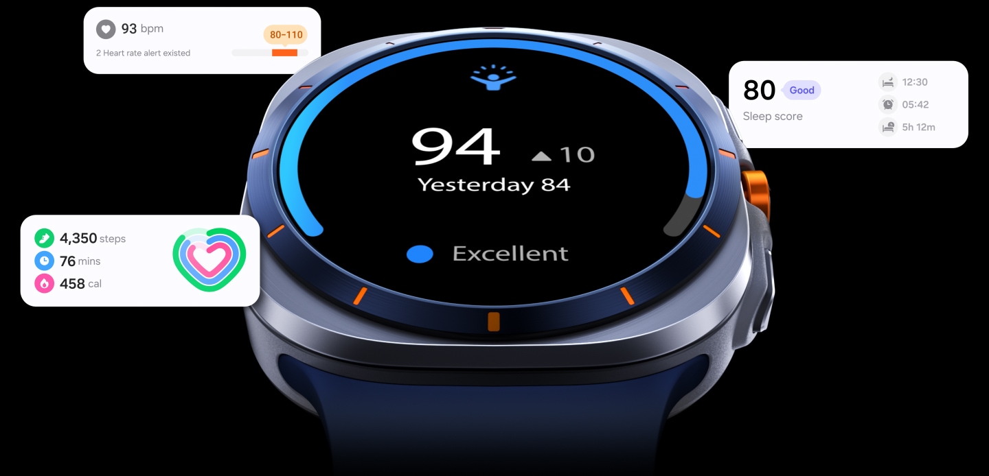 Dezvoltat pentru a depăși limitele, Galaxy Watch Ultra rezistă la temperaturi de până la 55°C, 9.000 m altitudine, presiune sub apă de 10 ATM și să funcționeaze fluid în toate mediile, cu noul procesor puternic 3 nm. Mergi mai departe cu bateria care durează până la 100 de ore în modul Economisire baterie. Noul senzor BioActive te urmărește îndeaproape, iar Galaxy AI oferă informații, ghidându-te să-ți depășești limitele. Acum disponibil în culoarea albastru-titan – o nuanță care întruchipează rezistența și este gata să meargă cu tine în orice aventură. , , , , , ,