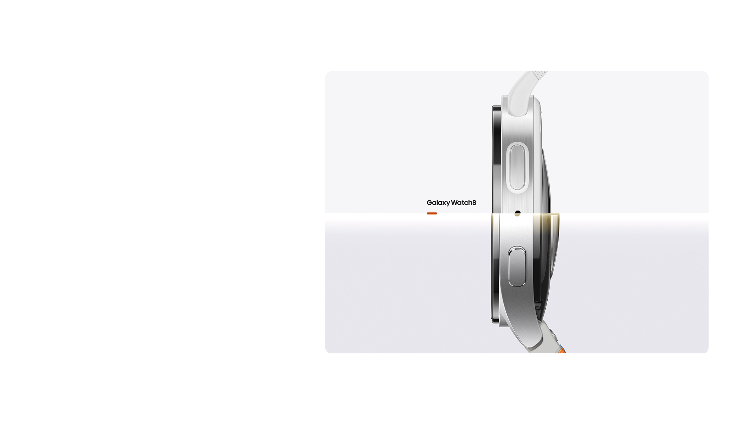Vedere laterală a Galaxy Watch7, apoi, de sus în jos, apare treptat o vedere laterală a Galaxy Watch8 comparând grosimea dintre cele 2 ceasuri inteligente. Când apare imaginea laterală completă a Galaxy Watch8, este prezentată fixată de o curea sport albă, fixată într-o buclă. Galaxy Watch8 se întoarce apoi ușor, dezvăluind cadranul.