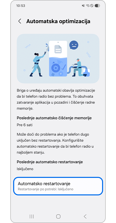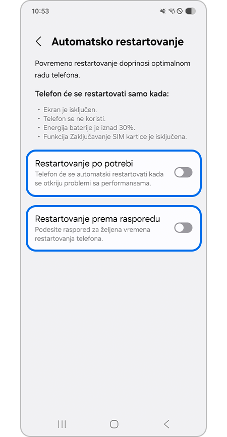 - Ako ne restartujete svoj telefon duži vremenski period, mogu se javiti problemi. Da biste održali optimalne performanse, preporučujemo da omogućite Automatsko restartovanje.