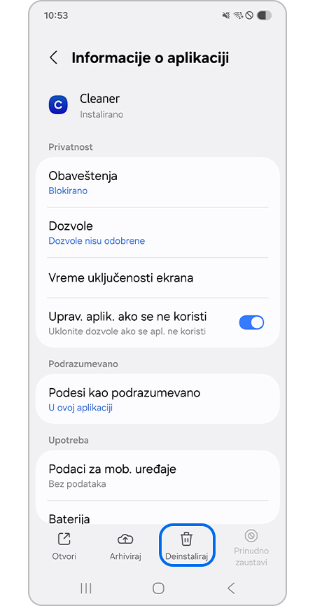 - Aplikacija "Cleaner" (Čistač) je izmišljen primer napravljen u ilustrativne svrhe i ne predstavlja pravu ili postojeću aplikaciju.