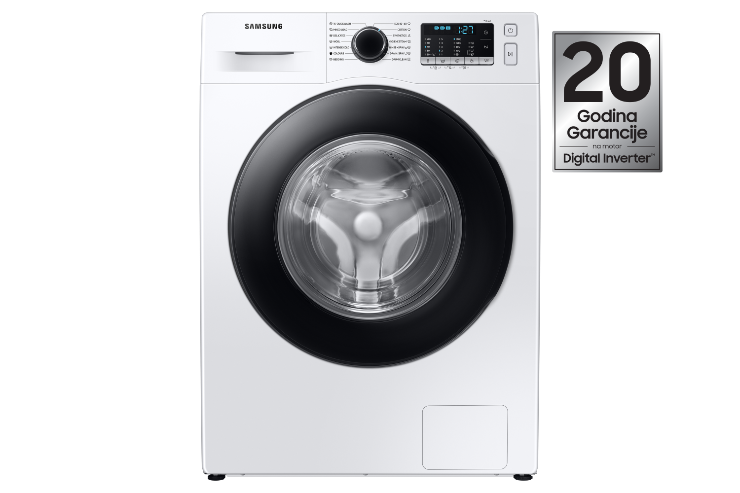 * Generalno, nivo smanjenja buke iznosi 5dBA tokom ciklusa pranja i 3dBA tokom centrifuge. Podaci su dobijeni na osnovu ERP oznaka, F500 8 kg 1400 rpm WF80F5E5P4W za digitalni inverter motor i Vistula 8 kg 1400 rpm WF1804WPC za univerzalni motor. ** Sertifikat trajnosti od 23 godine koji dodeljuje Udruženje za električne, elektronske i informacione tehnologije u Nemačkoj (Verband Deutscher Elektrotechniker – VDE). Stvarni vek trajanja može da varira u zavisnosti od okolnosti korišćenja. *** Od maja 2022. 20 godina garancije na delove važi samo za digitalni inverter motor.