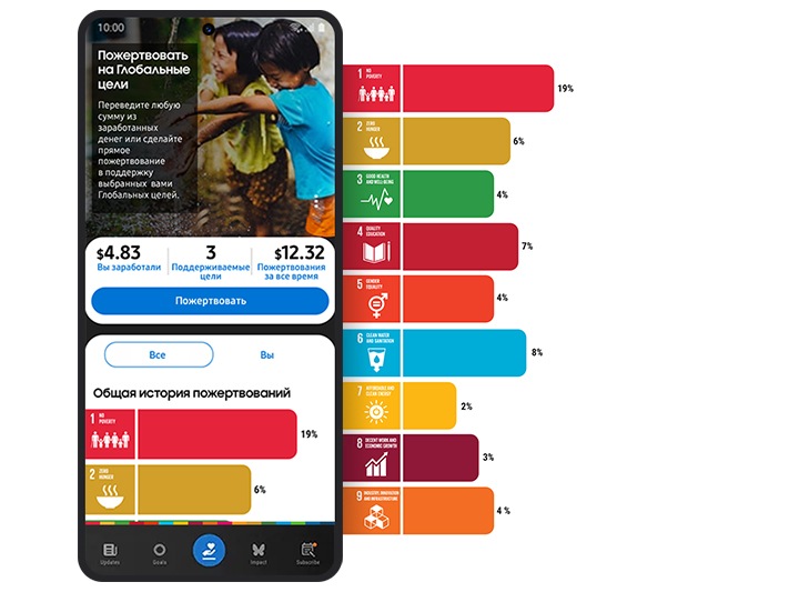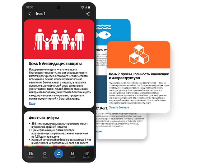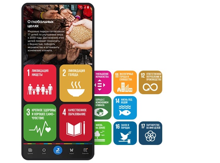 Приложение Samsung Global Goals («Глобальные цели») поможет каждому внести свой вклад в построение светлого будущего. Узнайте о каждой из 17 целей и о том, как они влияют на сообщества по всему миру. Доход от рекламы в приложении, которую вы видите, можно направить на достижение выбранной вами цели. Вместе