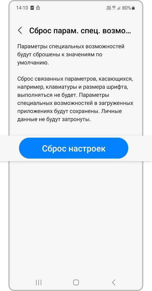 При сбросе настроек личные данные не удаляются. Настройки Talkback будут сброшены, а сама функция отключится.
