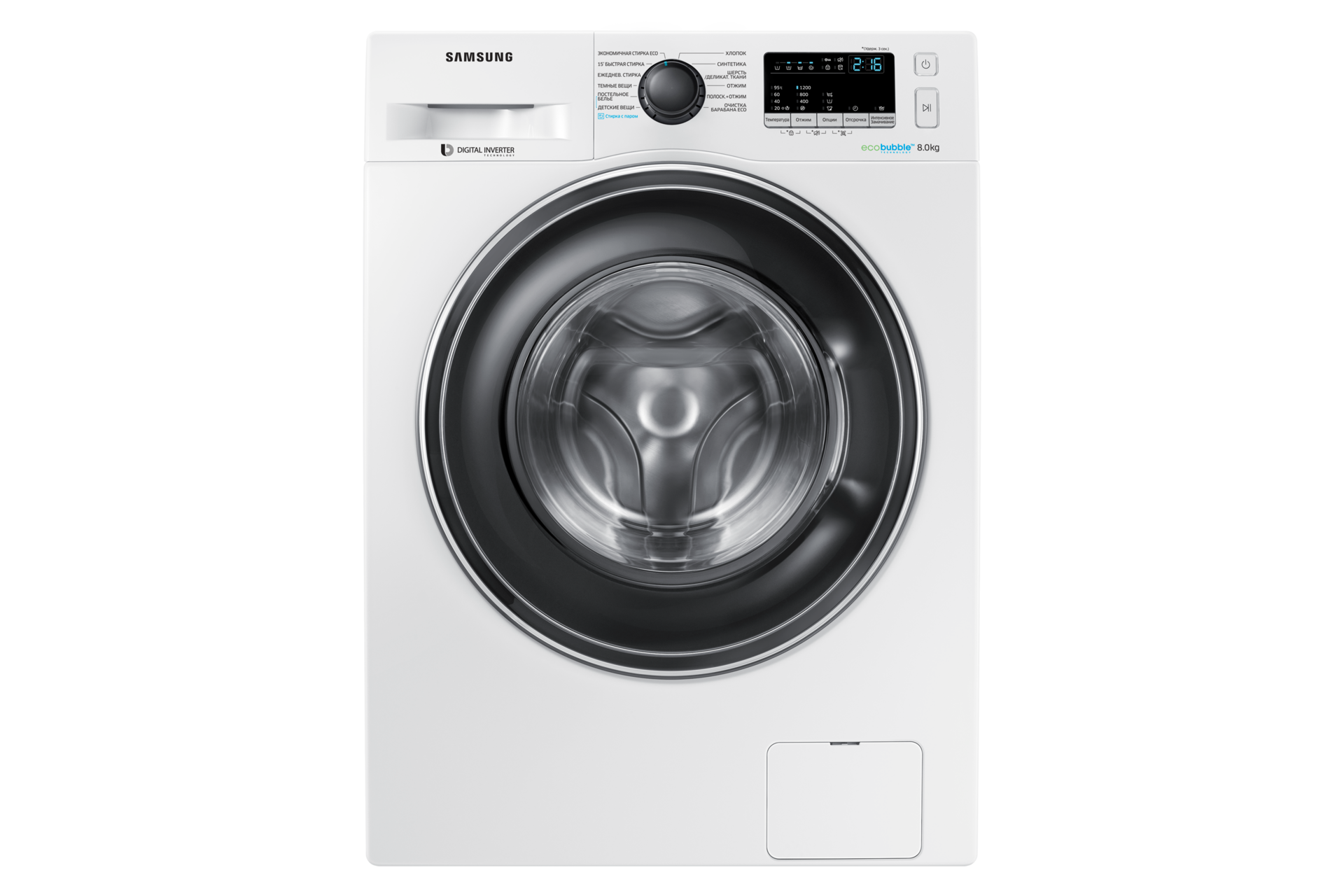 ¹ Соответствует процедуре испытаний по стандарту IEC 60456 Ed.5/4 кг загрузку / Интенсивная стирка Eco холодная вода (WF80F5E5U4W) и Хлопок 40° без технологии ecobubble™ (WF0702WKU). В отдельных случаях результаты могут быть другими.