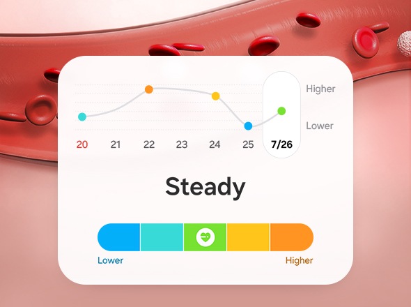 افهم صحة الدورة الدموية من خلال عرض رسم بياني بسيط. باستخدام ساعة Galaxy Watch، يمكنك قياس الحمل الوعائي الأساسي أثناء نومك لمدة أول 3 ليالٍ، ثم تتبع المستويات بانتظام لتلقي تقارير الاتجاهات اليومية. إذا استمر حمل الأوعية الدموية مرتفعًا، ففكر في تعديل نمط حياتك - من العادات الغذائية إلى التمارين الروتينية، وأنماط النوم ومستويات الإجهاد - لدعم رفاهيتك. 21 ،20