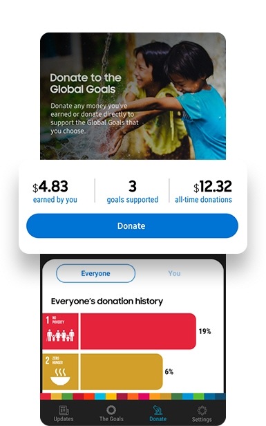 The Samsung Global Goals app is free. By simply looking at in-app advertisements, you can raise funds that can be donated to any goal of your choice. But you don't have to wait for money to accrue. Jump start a goal's progress at any time with direct payments. To view your previous donations, even if you’ve installed a new Global Goals app, simply sign into your Samsung Account.