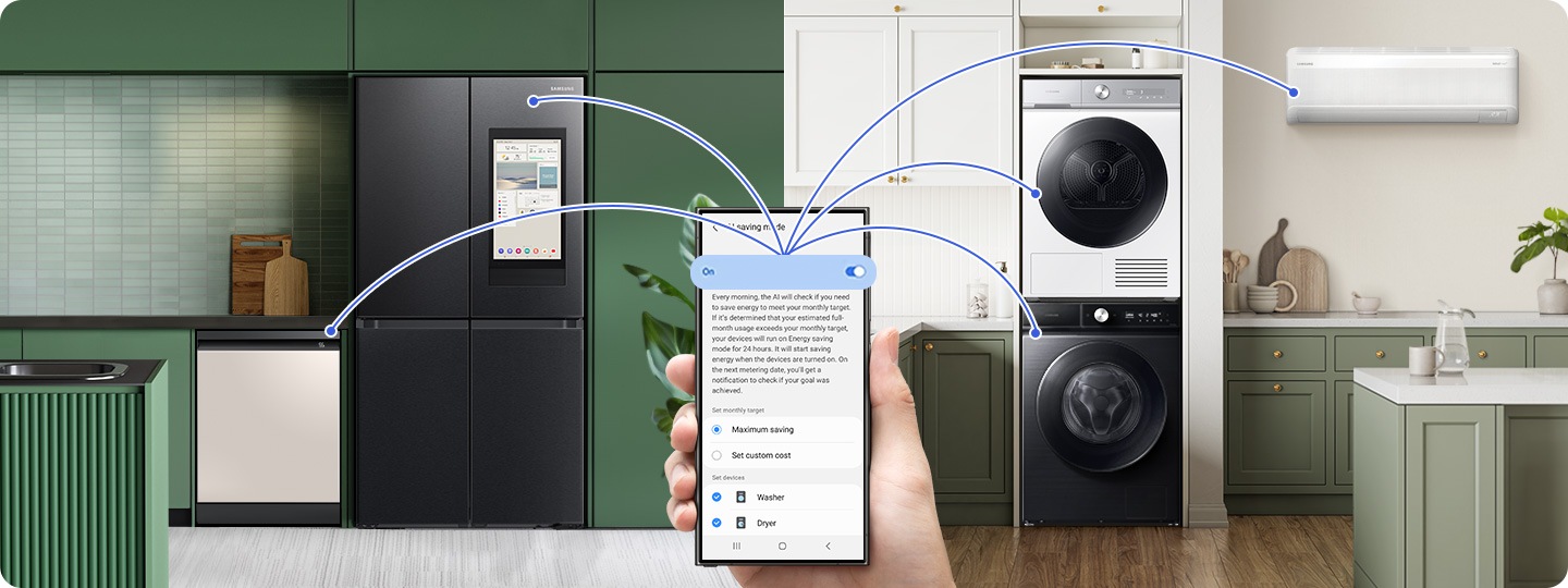 1. Only available for smart appliances that are compatible with SmartThings. The SmartThings App is available on Android and iOS devices. A Wi-Fi connection and a Samsung account are required.