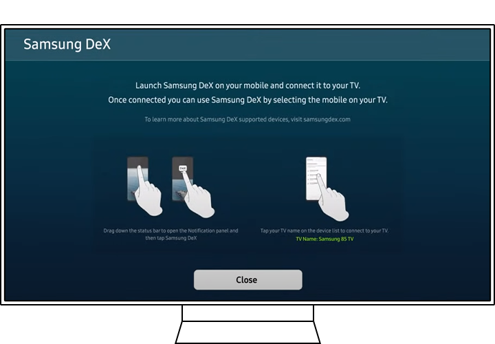 After you complete all of steps above, your TV screen will switch over to your Samsung DeX screen. After you complete all of steps above, your TV screen will switch over to your Samsung DeX screen.