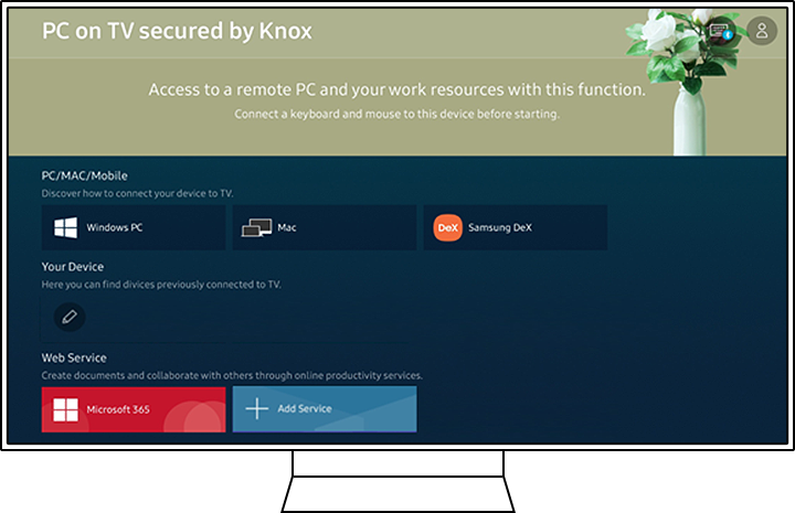 Easy Connection allows you to remotely control your PC through an app. Screen Sharing mirrors the PC that has been connected to the same Wi-Fi network. Samsung DeX allows you to use your mobile as a PC on the TV. And Microsoft 365 can be accessed directly using the TV web browser.