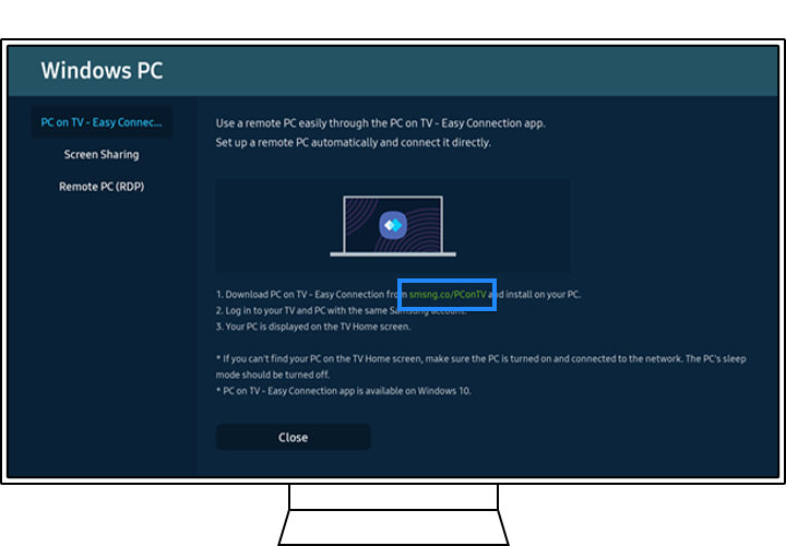 The Easy Connection to Screen App allows you to control your PC from your Smart TV. First, install the app on your PC, and then log in with your Samsung account. Make sure your keyboard and mouse are connected to the TV, and follow the detailed guide on how to access to your PC on the TV.