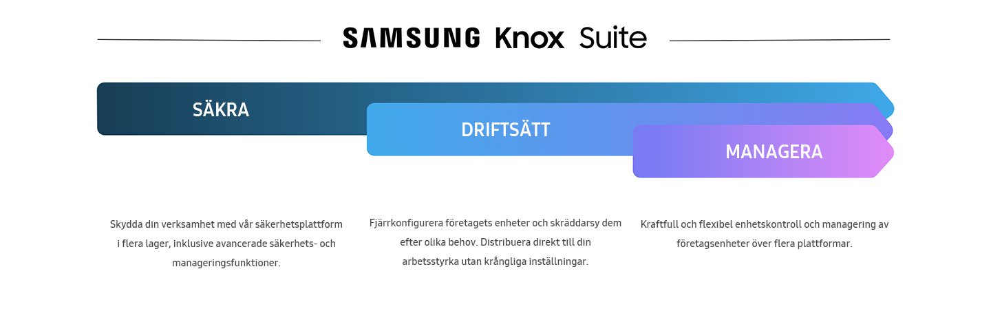 Säkra, driftsätt och managera med Knox Suite. Paketet med ett antal Knox-lösningar ingår i Enterprise Edition och gör att IT-administratörer kan sköta alla steg i hanteringen av företagets mobiler. Knox Suite säkerställer att alla dina Enterprise Edition-enheter är redo att användas direkt och är automatiskt registrerade, managerade och skyddade av säkerhetsplattformen Knox.