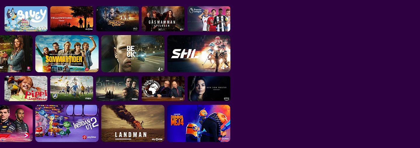 *Gäller vid köp av utvalda Samsung-projektorer, utvalda Smart Monitors och utvalda 2025 års Samsung TV hos utvalda återförsäljare under perioden 2025-04-30 - 2026-03-31. Begränsningar av koder förekommer och streamingtjänsterbjudanden som ingår kan variera under perioden. Kampanjerna kräver att kund skapar konto hos aktuell streamingtjänst. Samsung kan visa reklam och kampanjer på Smart TV-gränssnittet och applikationer. Tillgänglighet av appar kan variera över tid och region. Villkor.