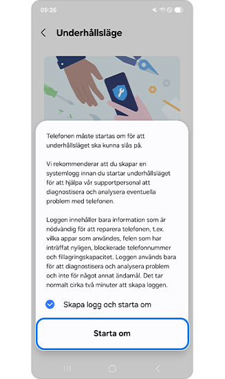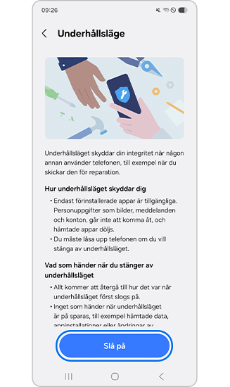 Underhållsläget skyddar din integritet när någon annan använder din telefon som till exempel när du skickar den för reparation. Den här nya integritetsfunktionen blockerar åtkomsten till din data för att du ska känna dig lugn när den är utom synhåll. I Underhållsläge kan man inte få åtkomst till din personliga data. Detta inkluderar bilder, meddelanden och konton. Endast förinstallerade appar är tillgängliga. Du behöver låsa upp din telefon för att stänga av Underhållsläget.