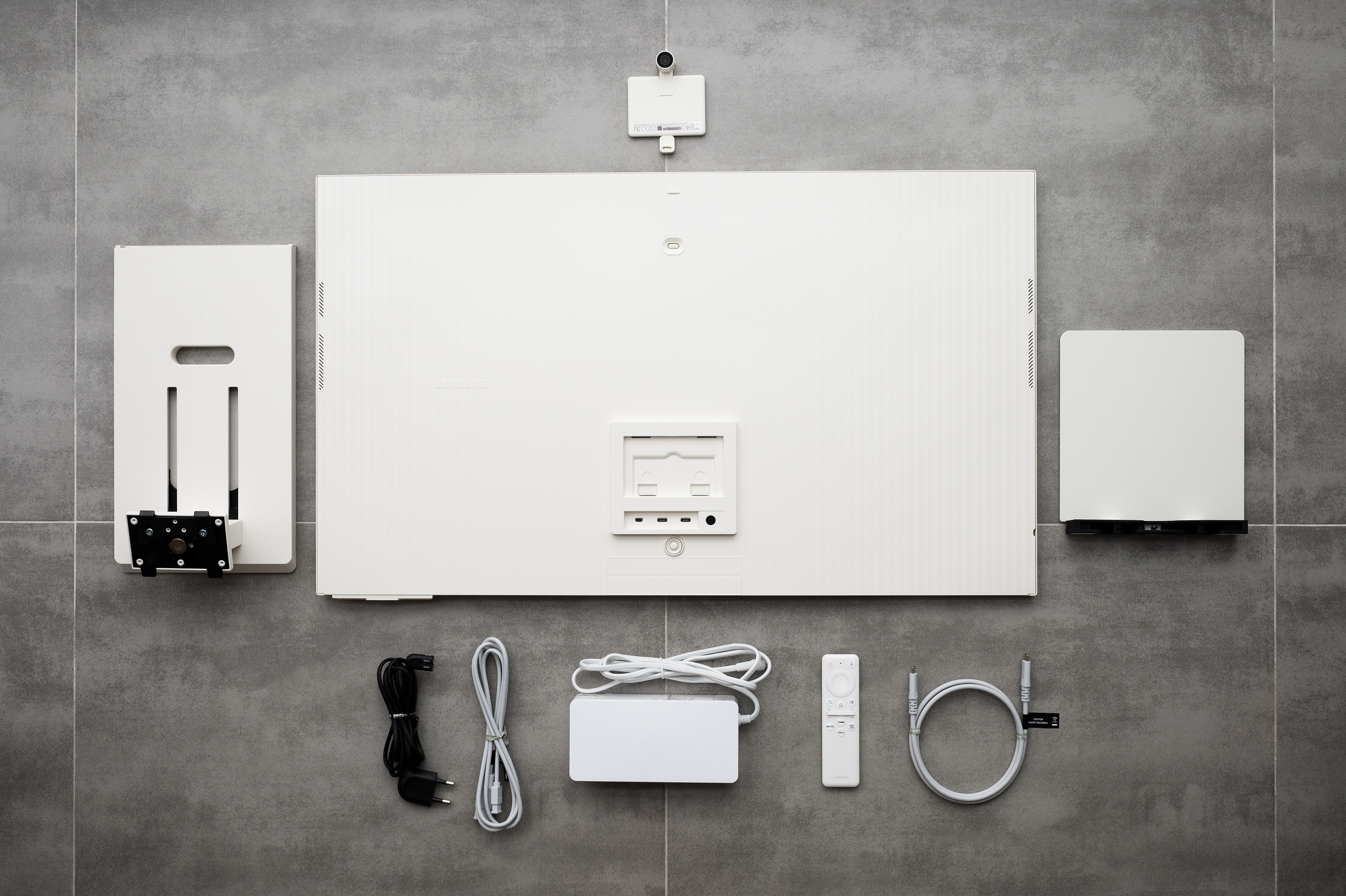 패키지를 열어 구성품을 펼쳐봤다. 우선, 32형 크기의 모니터 본체의 깔끔한 화이트 색상이 돋보인다. 모니터 후면의 세로형 패턴 디자인은 세련된 느낌이다. 별도로 제공되는 작은 카메라가 달린 캠이 눈에 띈다. 심플하면서도 단단해 보이는 스탠드와 USB-C타입 케이블 1개, 마이크로 HDMI 케이블 1개(Micro HDMI to HDMI), 그리고 모니터 패키지에서는 흔히 볼 수 없는 손바닥 안에 쏙 들어오는 리모콘까지 만났다. 지원하는 포트는 총 3개(외부입력 마이크로 HDMI 1개, 업스트림용 외부입력 USB-C 1개, 다운스트림용 USB-C 1개)로, 가운데 부분의 외부입력 USB-C 포트를 이용하면 65W 충전도 가능하다.