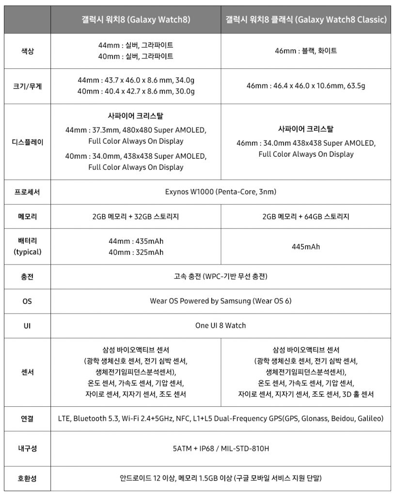 ‘갤럭시 워치8’은 실버, 그라파이트 두 가지 색상이 44mm, 40mm 크기로 출시된다. ‘갤럭시 워치8 클래식’은 블랙, 화이트 두 가지 색상이 46mm 한 가지 사이즈로 출시된다.