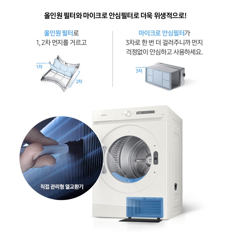 * 마이크로 안심필터 사용 시 필터 청소 주기 25회당 1회 알람 기준으로 제품 내 부가기능에서 3차필터알림 on 설정 필요 (초기 제품 구매 시 off 상태)