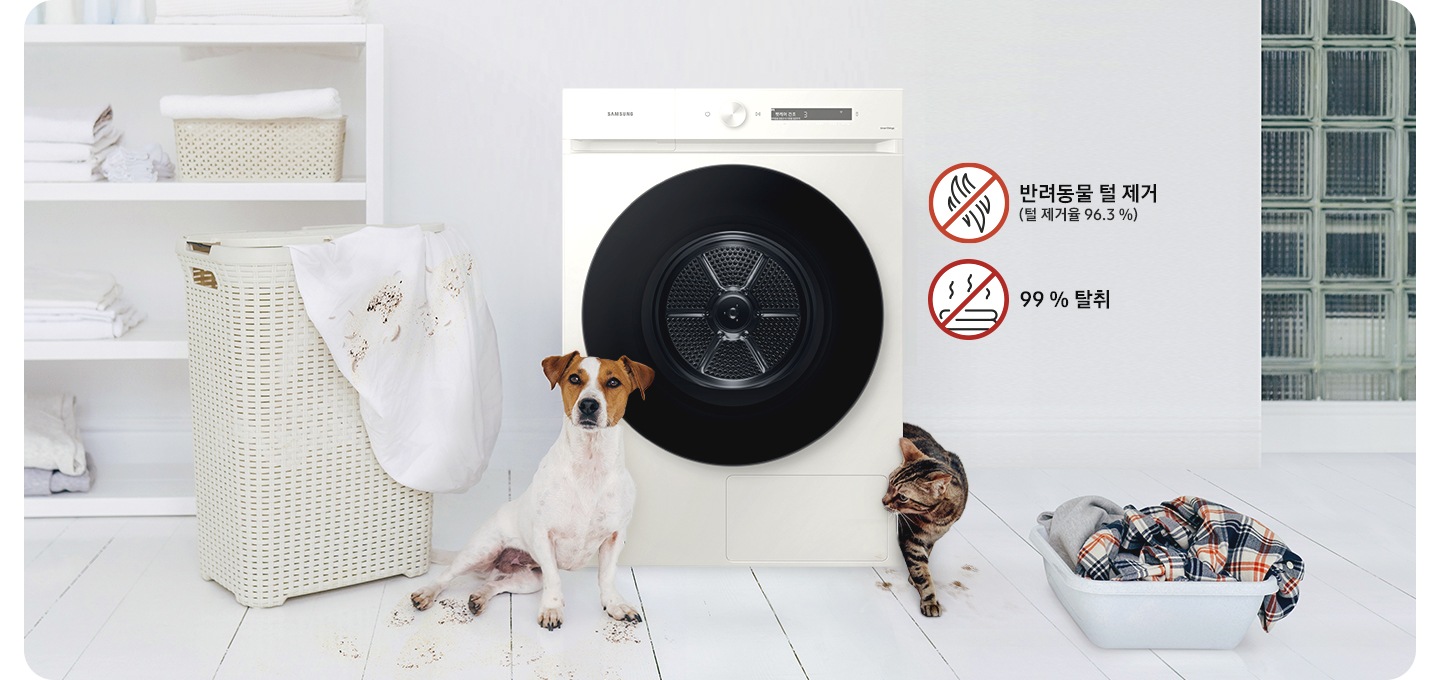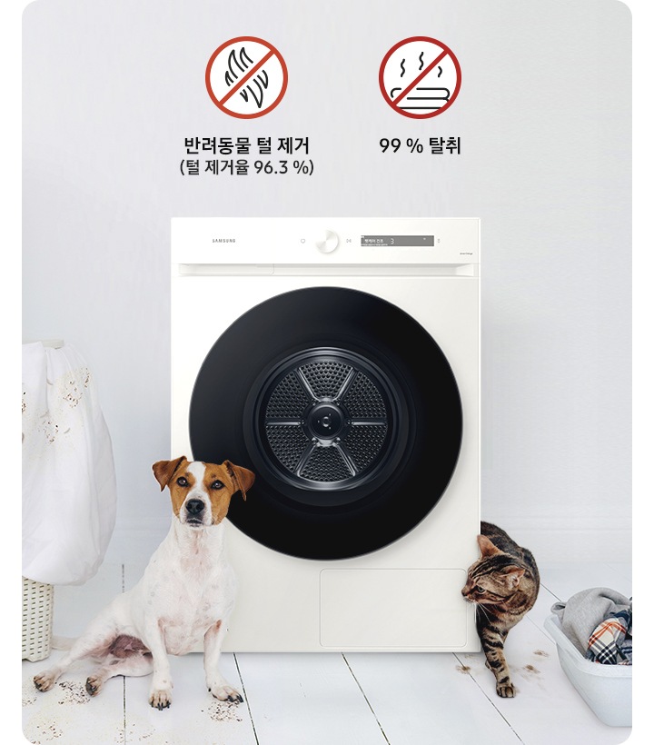 1) 펫케어 건조 털 제거율 96.3 %, 마른 세탁물 1.5 kg 부하 기준.