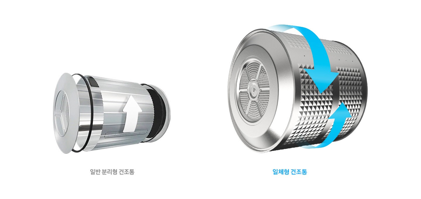 건조통과 뒤판이 일체형으로 결합되어 건조 시 바람, 먼지, 습기가 새어 나오지 않아 옷 구석구석 건조 가능합니다.