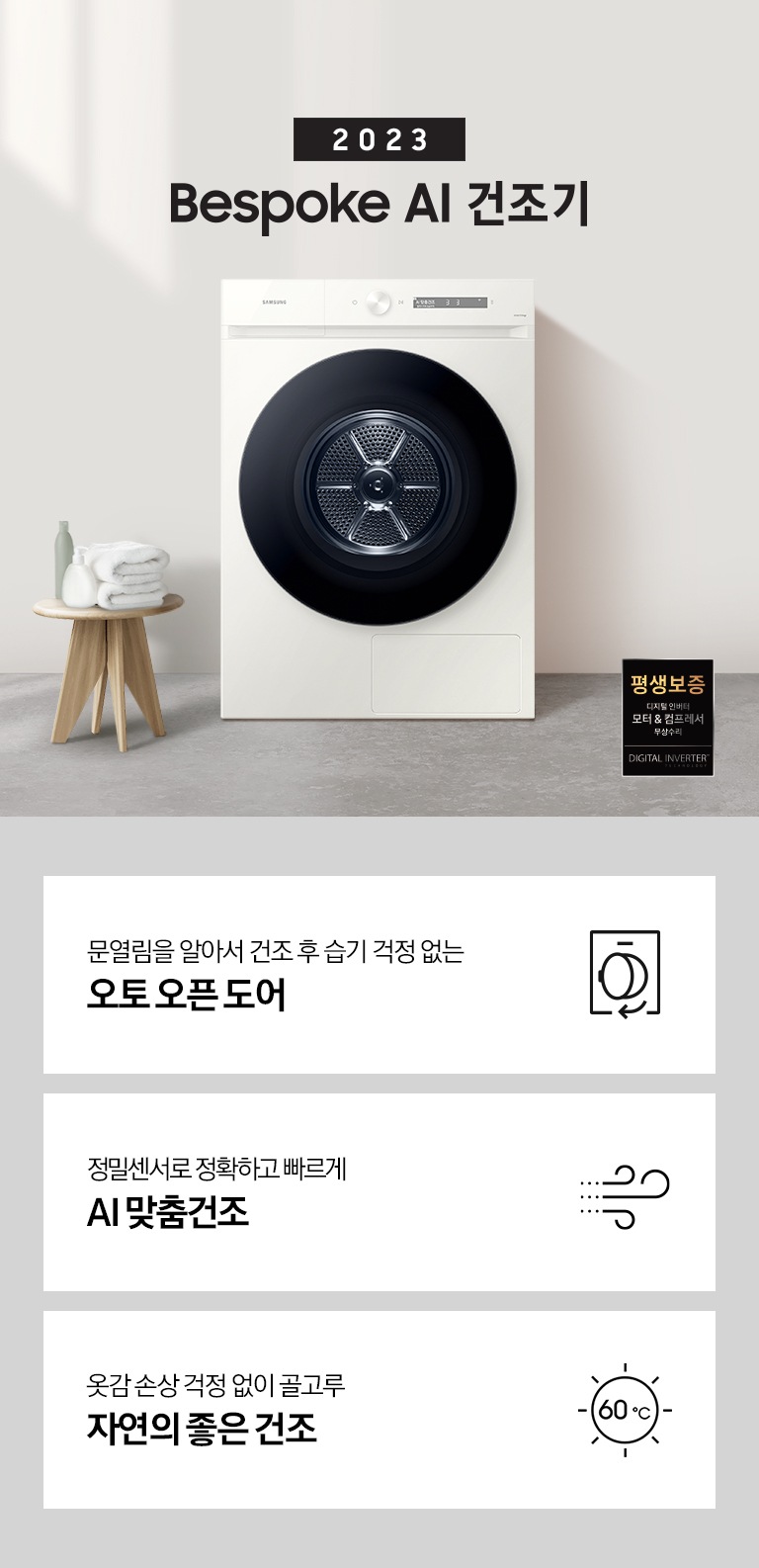 베이지톤의 욕실에 BESPOKE 그랑데 건조기 AI 제품이 놓여져 있습니다. 정밀센서로 정확하고 빠른 AI 맞춤건조, 건조 후 급기 걱정 없는 오토 오픈 도어, 사랑하는 반려동물을 위한 펫케어 코스 기능을 보여주고 있습니다. 베이지톤의 욕실에 BESPOKE 그랑데 건조기 AI 제품이 놓여져 있습니다. 정밀센서로 정확하고 빠른 AI 맞춤건조, 건조 후 급기 걱정 없는 오토 오픈 도어, 사랑하는 반려동물을 위한 펫케어 코스 기능을 보여주고 있습니다.