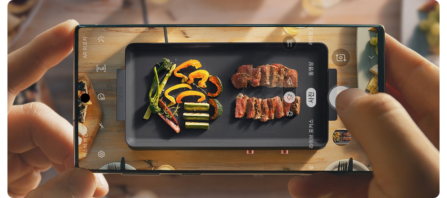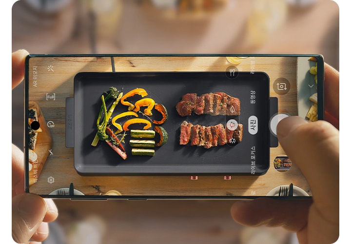 음식이 올려져 있는 더 플레이트를 핸드폰으로 촬영하고 있는 모습이 확대되어 보입니다. 오른손 엄지손가락으로 촬영 버튼을 누르고 있고, 아스파라거스, 단호박, 스테이크가 세팅된 더 플레이트가 핸드폰 카메라 화면 가장 가운데 보입니다. 음식이 올려져 있는 더 플레이트를 핸드폰으로 촬영하고 있는 모습이 확대되어 보입니다. 오른손 엄지손가락으로 촬영 버튼을 누르고 있고, 아스파라거스, 단호박, 스테이크가 세팅된 더 플레이트가 핸드폰 카메라 화면 가장 가운데 보입니다.