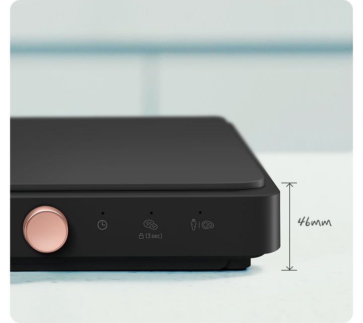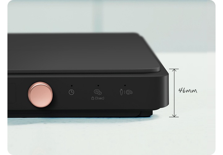 하얀색의 주방 배경이 보이고 더 플레이트의 오른쪽 모서리 부분 정면이 확대되어 보입니다. 골드 컬러의 조절 버튼과 타이머 아이콘, 홀드 아이콘, 야채와 고기 아이콘이 나란히 보이고 더 플레이트의 측면에는 검은색 화살표로 두께를 표현하는 그림과 함께 46mm라는 글자가 적혀 있습니다. 하얀색의 주방 배경이 보이고 더 플레이트의 오른쪽 모서리 부분 정면이 확대되어 보입니다. 골드 컬러의 조절 버튼과 타이머 아이콘, 홀드 아이콘, 야채와 고기 아이콘이 나란히 보이고 더 플레이트의 측면에는 검은색 화살표로 두께를 표현하는 그림과 함께 46mm라는 글자가 적혀 있습니다.