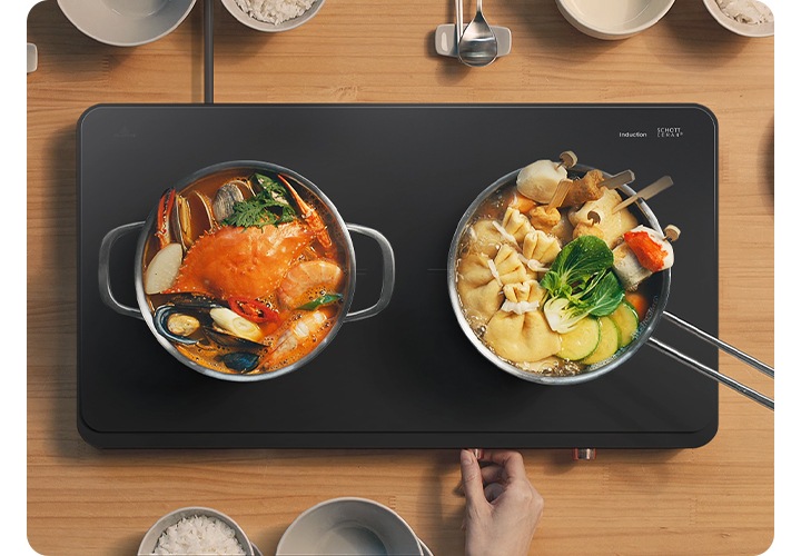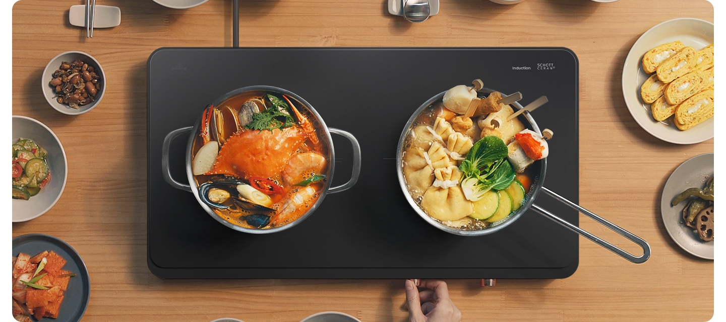 각각 사용 가능한 2구 인덕션으로 동시에 두 가지 요리를 할 수 있으니 국과 반찬을 동시에 따뜻하게 조리해 먹을 수 있어요.
