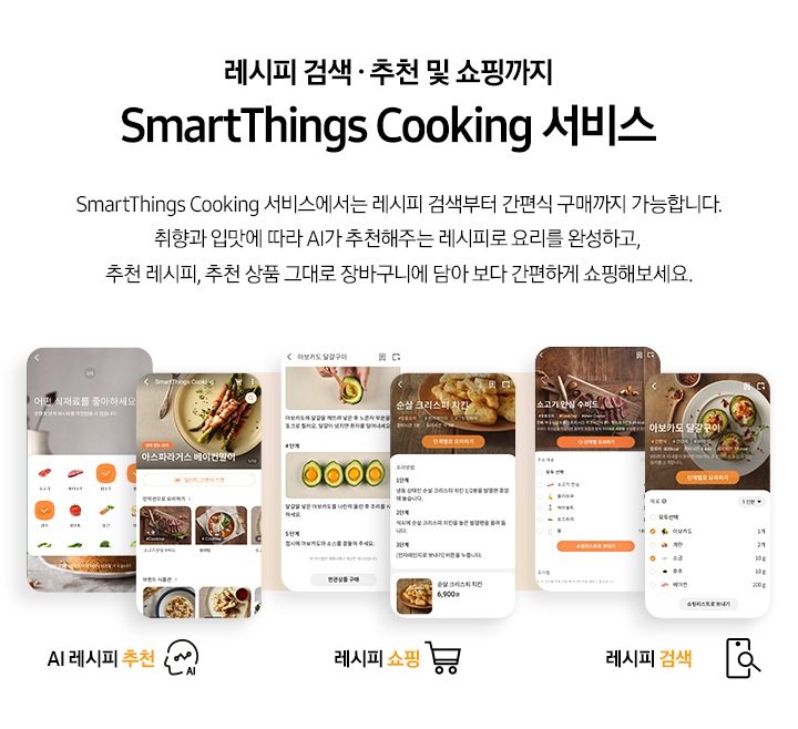 좌측에는 총 5단계의 조리과정을 gif 애니메이션 형태로 보여줍니다.  Step 01 앱 실행 후, 라이프 탭에서 'SmartThings Cooking' 클릭 (클릭을 표현하는 손 아이콘) 아래로 SmartThing Cooking 인덕션으로 요리하기 잔치국수가 선택된 화면 이미지  Step 02 '인덕션으로 요리하기' 클릭 (클릭을 표현하는 손 아이콘) (바로 검색 버튼을 통해 조회도 가능) 아래로 인덕션으로 요리하기 중 소고기 안심 수비드, 동태탕 등 선택하는 화면 이미지  Step 03 원하는 레시피 선택 아래로 맞춤 요리 > 내 조리기기 전용으로 만든 맞춤형 요리를 만들어보세요. 라는 문구와 함께 소고기 안심 수비드, 콩나물국 중 선택하는 화면 이미지  Step 04 레시피대로 준비가 완료되면 '인덕션으로 보내기' 클릭 (클릭을 표현하는 손 아이콘) 아래로 인덕션에 보내기 ㅣ 약 124분 이라고 써진 화면 이미지  Step 05 앱에서 보낸 조리값으로 맛있는 요리 시작! 아래로 3단계 인덕션에서 알림음이 울리면 밀봉한 고기를 넣으세요. 라고 조리과정을 안내하는 화면 이미지 우측에는 대리석 느낌의 주방 상판에 BESPOKE 인덕션 빌트인 (플렉스) 글램 화이트가 설치되어 있고, 그 위로 콩나물국이 담긴 쿡팟이 있습니다. 인덕션 좌측 아래로 SmartThings 로고가 있습니다. 좌측에는 총 5단계의 조리과정을 gif 애니메이션 형태로 보여줍니다.  Step 01 앱 실행 후, 라이프 탭에서 'SmartThings Cooking' 클릭 (클릭을 표현하는 손 아이콘) 아래로 SmartThing Cooking 인덕션으로 요리하기 잔치국수가 선택된 화면 이미지  Step 02 '인덕션으로 요리하기' 클릭 (클릭을 표현하는 손 아이콘) (바로 검색 버튼을 통해 조회도 가능) 아래로 인덕션으로 요리하기 중 소고기 안심 수비드, 동태탕 등 선택하는 화면 이미지  Step 03 원하는 레시피 선택 아래로 맞춤 요리 > 내 조리기기 전용으로 만든 맞춤형 요리를 만들어보세요. 라는 문구와 함께 소고기 안심 수비드, 콩나물국 중 선택하는 화면 이미지  Step 04 레시피대로 준비가 완료되면 '인덕션으로 보내기' 클릭 (클릭을 표현하는 손 아이콘) 아래로 인덕션에 보내기 ㅣ 약 124분 이라고 써진 화면 이미지  Step 05 앱에서 보낸 조리값으로 맛있는 요리 시작! 아래로 3단계 인덕션에서 알림음이 울리면 밀봉한 고기를 넣으세요. 라고 조리과정을 안내하는 화면 이미지 우측에는 대리석 느낌의 주방 상판에 BESPOKE 인덕션 빌트인 (플렉스) 글램 화이트가 설치되어 있고, 그 위로 콩나물국이 담긴 쿡팟이 있습니다. 인덕션 좌측 아래로 SmartThings 로고가 있습니다.