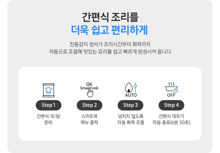 * AI 끓음 감지, 간편식 국/탕 데우기 기능 사용 시 주변에 진동이나 큰 소음이 발생할 경우 기능이 제대로 동작하지 않을 수 있습니다.(믹서기, 커피 머신, 전기주전자 등의 동작 유의)