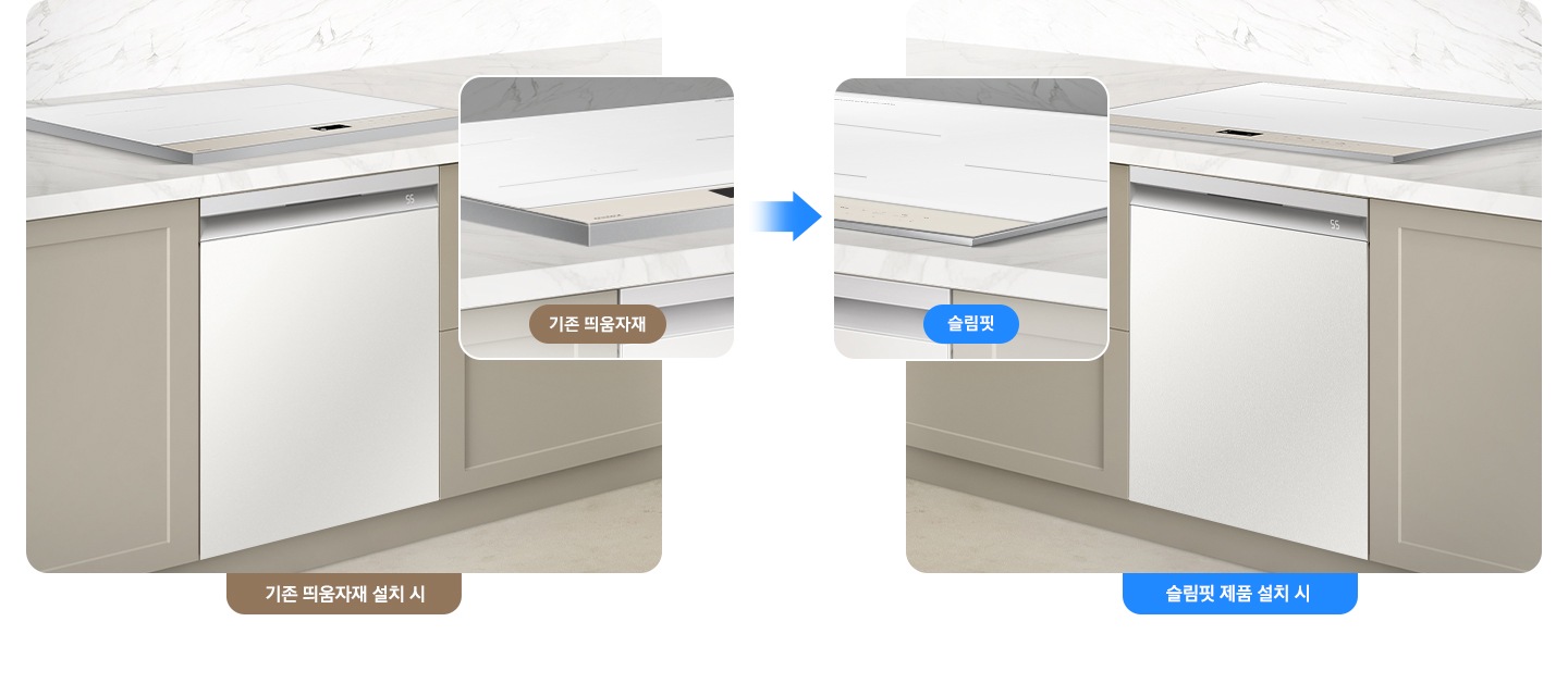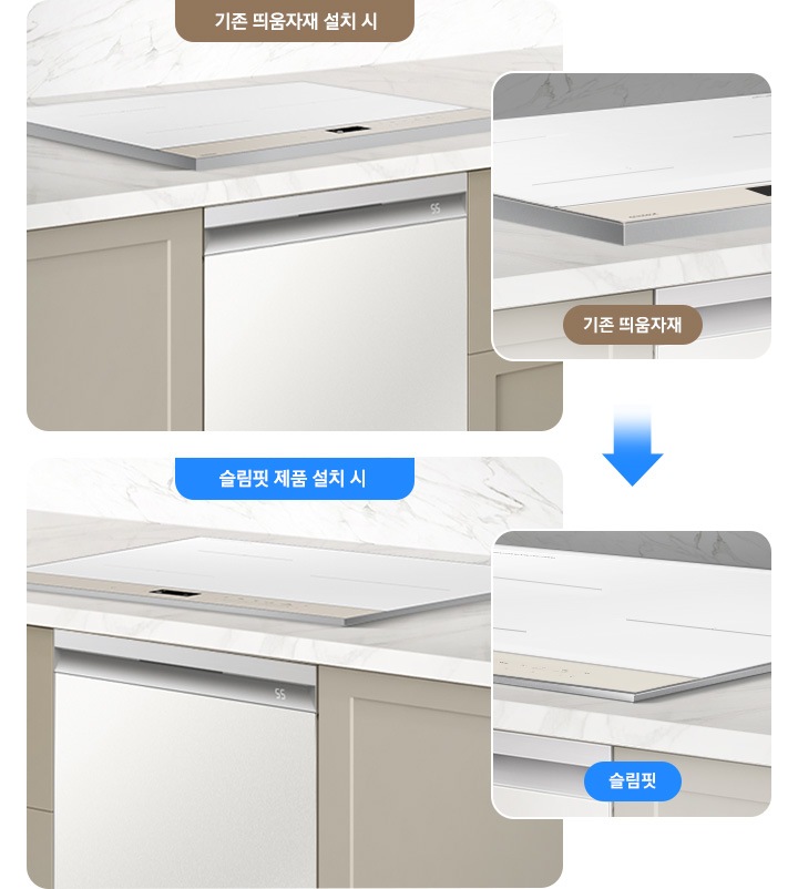 제품의 매립부가 얇아진 슬림핏 구조로 띄움자재 없이 식기세척기와 깔끔한 직렬 설치가 가능합니다.