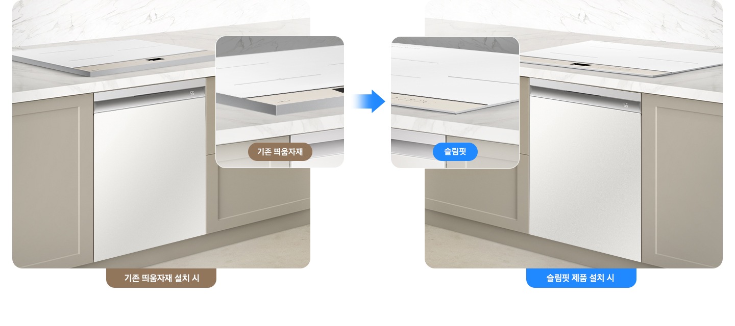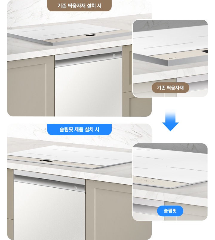 제품의 매립부가 얇아진 슬림핏 구조로 띄움자재 없이 식기세척기와 깔끔한 직렬 설치가 가능합니다.