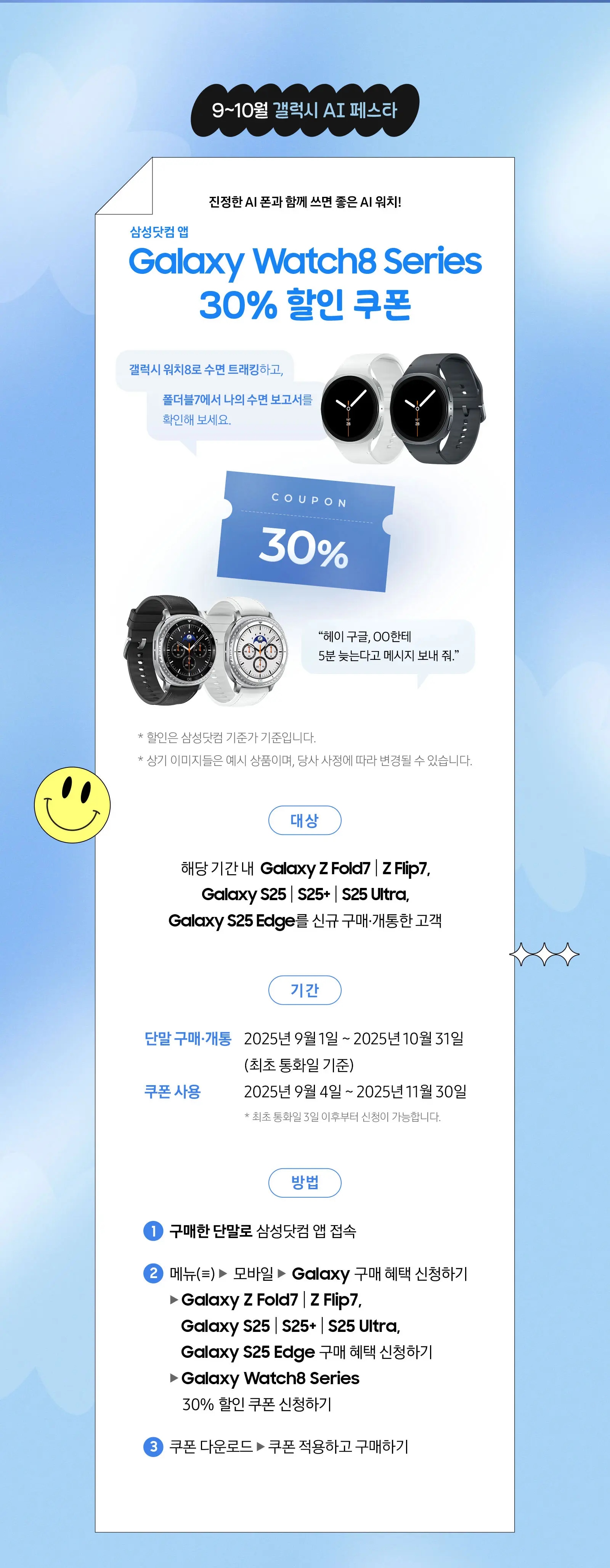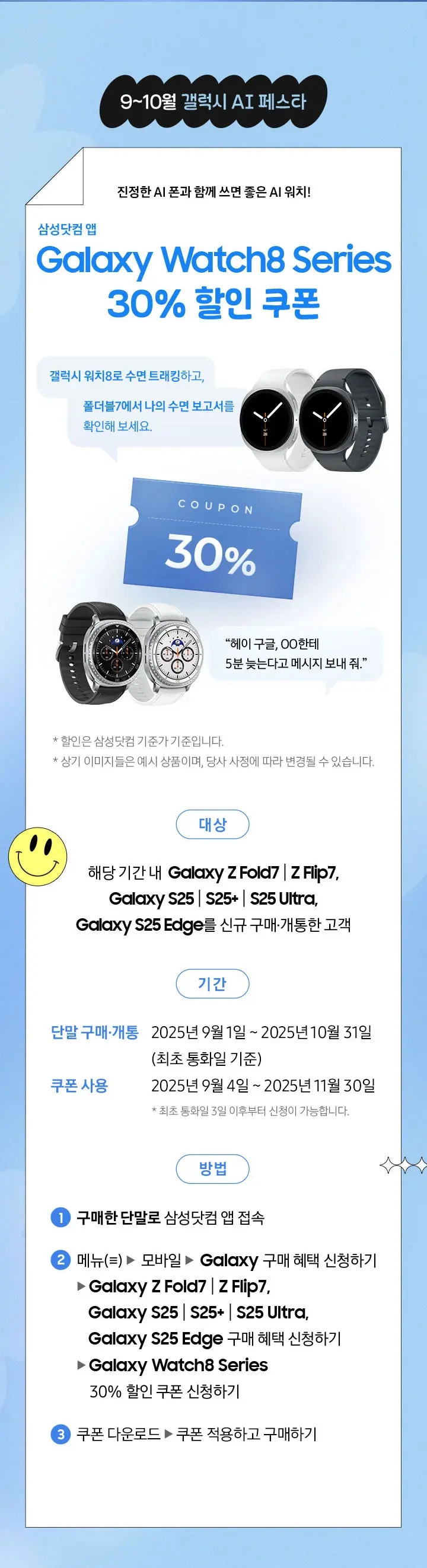 - 9~10월 갤럭시 AI 페스타 삼성닷컴 앱 Galaxy Watch8 Series 30% 할인 쿠폰 유의사항