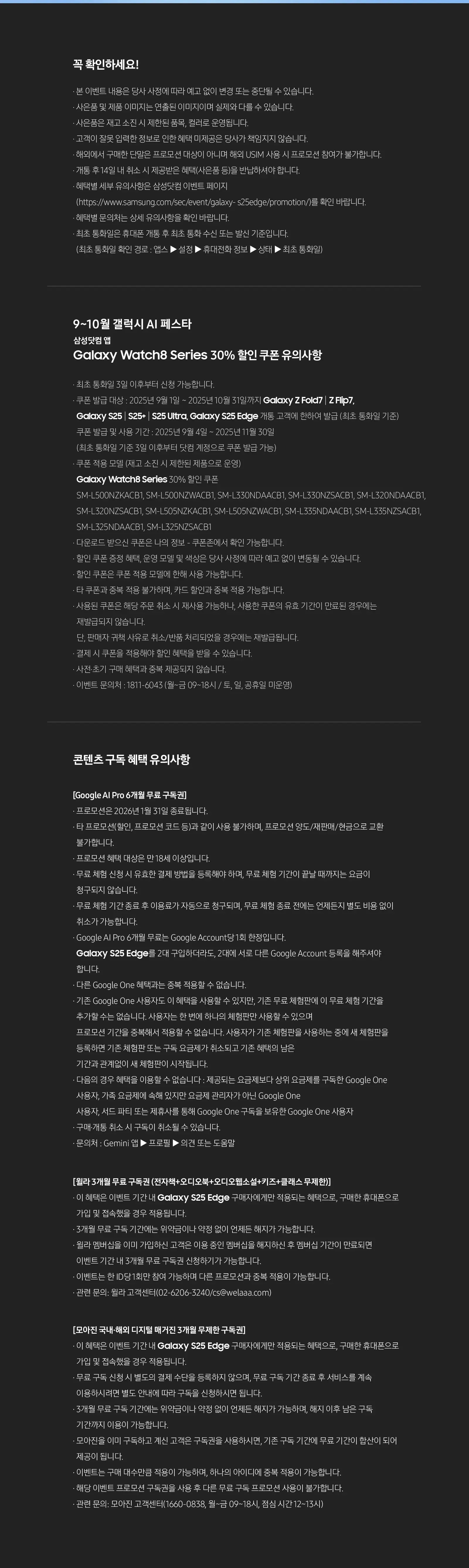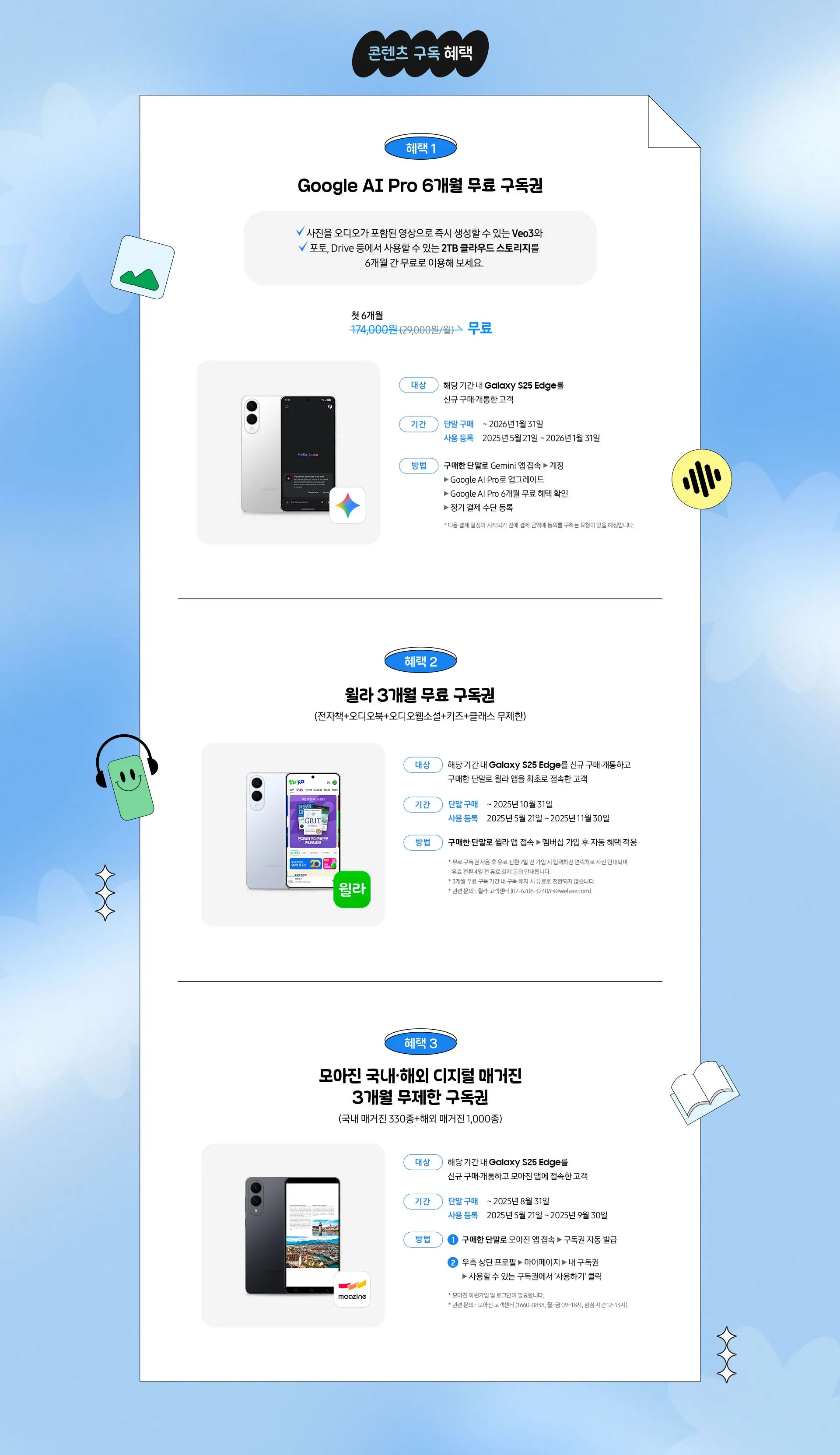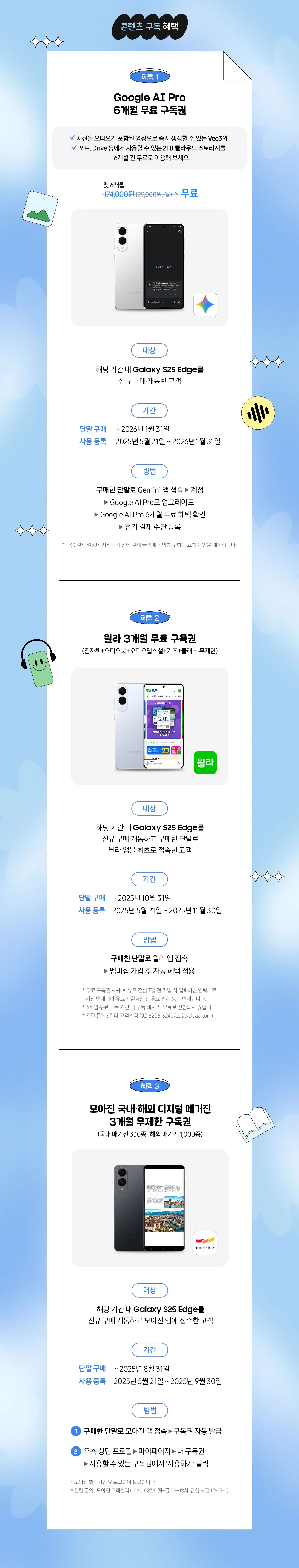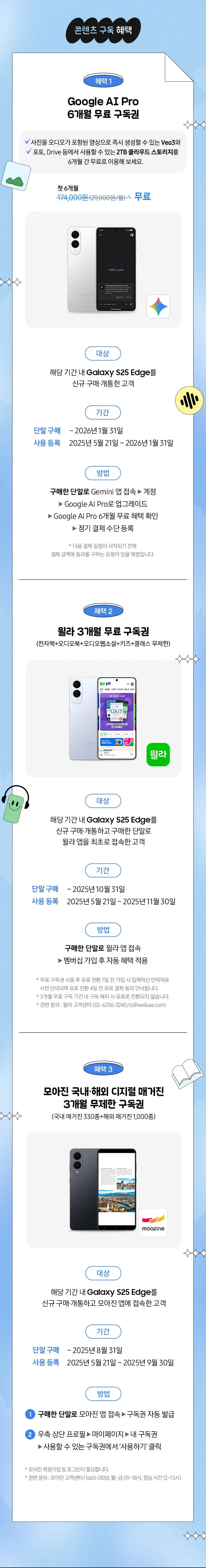 - [Google One AI Premium 6개월 무료 구독권] · 프로모션은 2026년 1월 31일 종료됩니다. · 타 프로모션(할인, 프로모션 코드 등)과 같이 사용 불가하며, 프로모션 양도/재판매/현금으로 교환 불가합니다. · 프로모션 혜택 대상은 만 18세 이상입니다. · 무료 체험 신청 시 유효한 결제 방법을 등록해야 하며, 무료 체험 기간이 끝날 때까지는 요금이 청구되지 않습니다. · 무료 체험 기간 종료 후 이용료가 자동으로 청구되며, 무료 체험 종료 전에는 언제든지 별도 비용 없이 취소가 가능합니다. · Google One AI Premium 6개월 무료는 Google Account당 1회 한정입니다. Galaxy S25 Edge를 2대 구입하더라도, 2대에 서로 다른 Google Account 등록을 해주셔야 합니다. · 다른 Google One 혜택과는 중복 적용할 수 없습니다. · 기존 Google One 사용자도 이 혜택을 사용할 수 있지만, 기존 무료 체험판에 이 무료 체험 기간을 추가할 수는 없습니다. 사용자는 한 번에 하나의 체험판만 사용할 수 있으며 프로모션 기간을 중복해서 적용할 수 없습니다. 사용자가 기존 체험판을 사용하는 중에 새 체험판을 등록하면 기존 체험판 또는 구독 요금제가 취소되고 기존 혜택의 남은 기간과 관계없이 새 체험판이 시작됩니다. · 다음의 경우 혜택을 이용할 수 없습니다 : 제공되는 요금제보다 상위 요금제를 구독한 Google One 사용자, 가족 요금제에 속해 있지만 요금제 관리자가 아닌 Google One 사용자, 서드 파티 또는 제휴사를 통해 Google One 구독을 보유한 Google One 사용자 · 구매·개통 취소 시 구독이 취소될 수 있습니다. [윌라 3개월 무료 구독권 (전자책+오디오북+오디오웹소설+키즈+클래스 무제한)] · 이 혜택은 이벤트 기간 내 Galaxy S25 Edge 구매자에게만 적용되는 혜택으로, 구매한 휴대폰으로 가입 및 접속했을 경우 적용됩니다. · 3개월 무료 구독 기간에는 위약금이나 약정 없이 언제든 해지가 가능합니다. · 윌라 멤버십을 이미 가입하신 고객은 이용 중인 멤버십을 해지하신 후 멤버십 기간이 만료되면 이벤트 기간 내 3개월 무료 구독권 신청하기가 가능합니다. · 이벤트는 한 ID당 1회만 참여 가능하며 다른 프로모션과 중복 적용이 가능합니다. · 관련 문의: 윌라 고객센터(02-6206-3240/cs@welaaa.com) [모아진 국내·해외 디지털 매거진 3개월 무제한 구독권] · 이 혜택은 이벤트 기간 내 Galaxy S25 Edge 구매자에게만 적용되는 혜택으로, 구매한 휴대폰으로 가입 및 접속했을 경우 적용됩니다. · 무료 구독 신청 시 별도의 결제 수단을 등록하지 않으며, 무료 구독 기간 종료 후 서비스를 계속 이용하시려면 별도 안내에 따라 구독을 신청하시면 됩니다. · 3개월 무료 구독 기간에는 위약금이나 약정 없이 언제든 해지가 가능하며, 해지 이후 남은 구독 기간까지 이용이 가능합니다. · 모아진을 이미 구독하고 계신 고객은 구독권을 사용하시면, 기존 구독 기간에 무료 기간이 합산이 되어 제공이 됩니다. · 이벤트는 구매 대수만큼 적용이 가능하며, 하나의 아이디에 중복 적용이 가능합니다. · 해당 이벤트 프로모션 구독권을 사용 후 다른 무료 구독 프로모션 사용이 불가합니다. · 관련 문의: 모아진 고객센터(1660-0838, 월~금 09~18시, 점심 시간 12~13시)