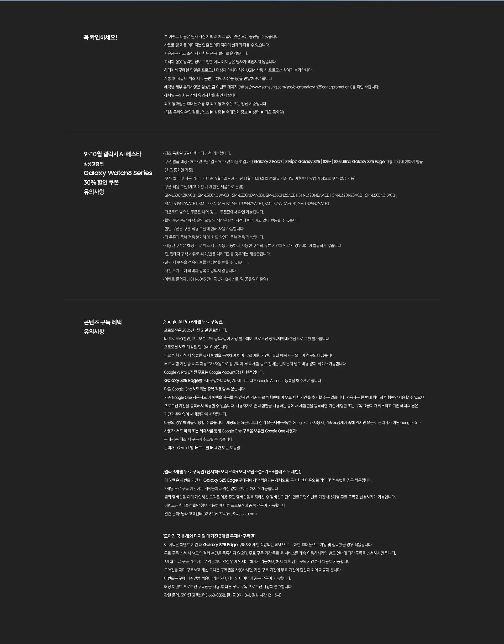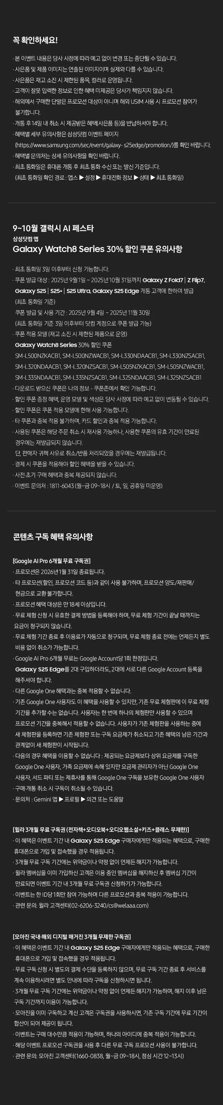 - · 본 이벤트 내용은 당사 사정에 따라 예고 없이 변경 또는 중단될 수 있습니다. · 사은품 및 제품 이미지는 연출된 이미지이며 실제와 다를 수 있습니다. · 사은품은 재고 소진 시 제한된 품목, 컬러로 운영됩니다. · 고객이 잘못 입력한 정보로 인한 혜택 미제공은 당사가 책임지지 않습니다. · 해외에서 구매한 단말은 프로모션 대상이 아니며 해외 USIM 사용 시 프로모션 참여가 불가합니다. · 개통 후 14일 내 취소 시 제공받은 혜택(사은품 등)을 반납하셔야 합니다. · 혜택별 세부 유의사항은 삼성닷컴 이벤트 페이지 (https://www.samsung.com/sec/event/galaxy-s25edge/promotion/)를 확인 바랍니다. · 혜택별 문의처는 상세 유의사항을 확인 바랍니다. · 최초 통화일은 휴대폰 개통 후 최초 통화 수신 또는 발신 기준입니다. (최초 통화일 확인 경로 : 앱스 ▶ 설정 ▶ 휴대전화 정보 ▶ 상태 ▶ 최초 통화일)