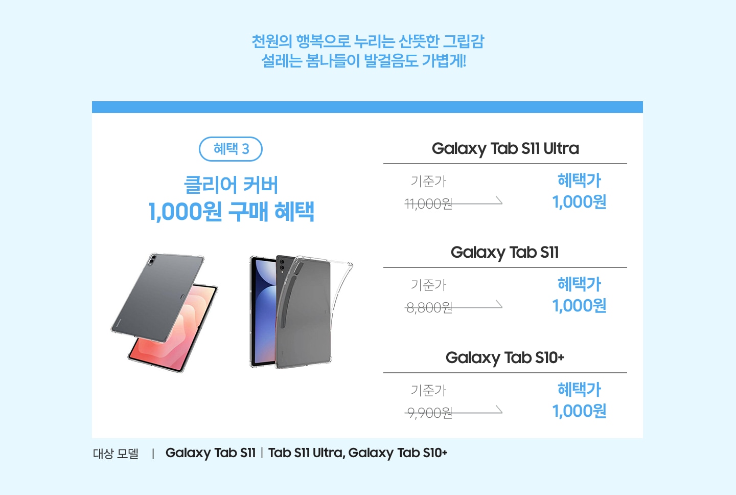 - Galaxy Tab S11 Ultra 클리어 커버 기준가:11,000원, 혜택가: 1,000원