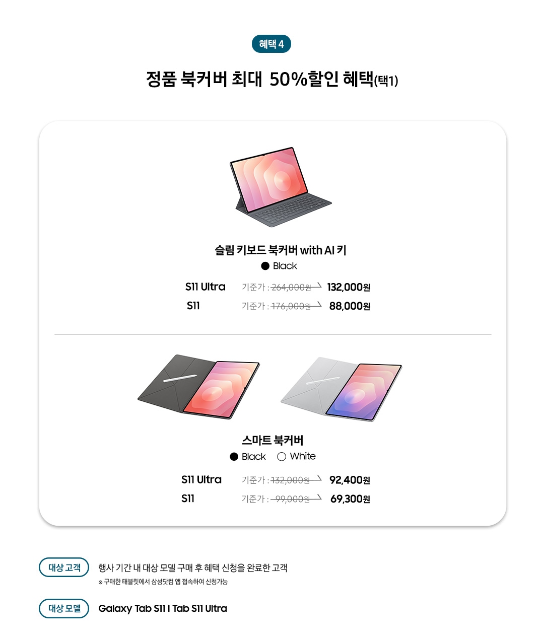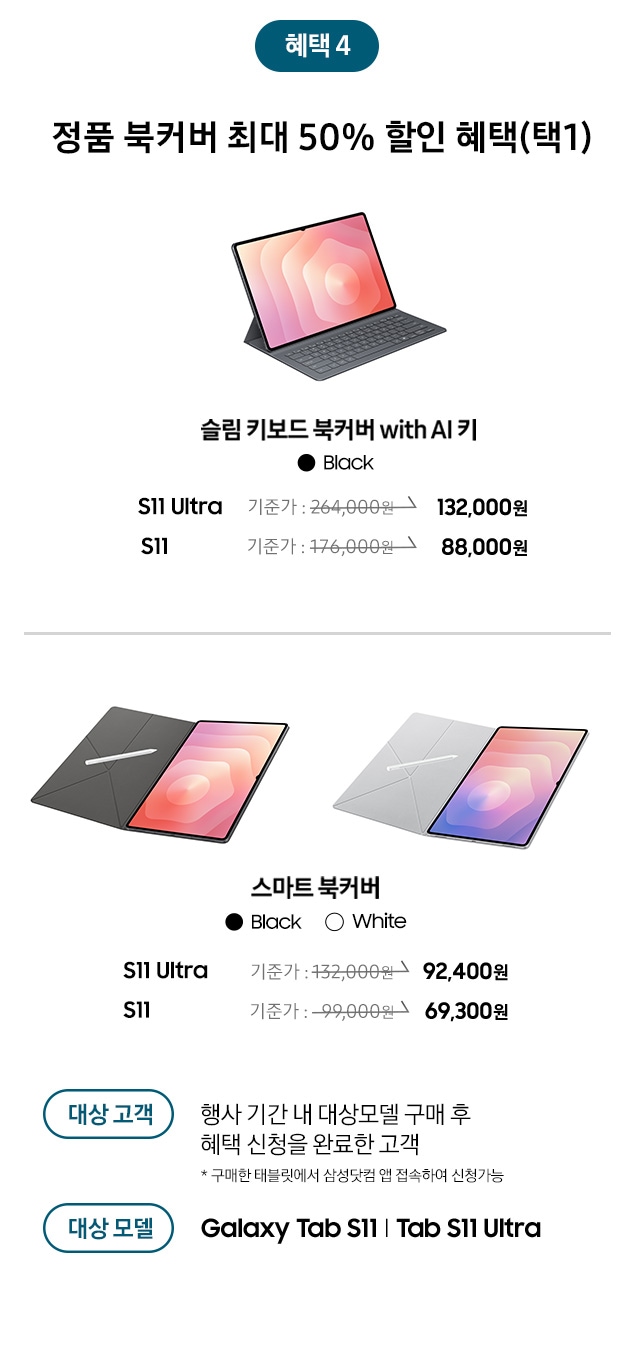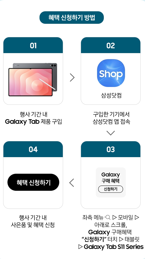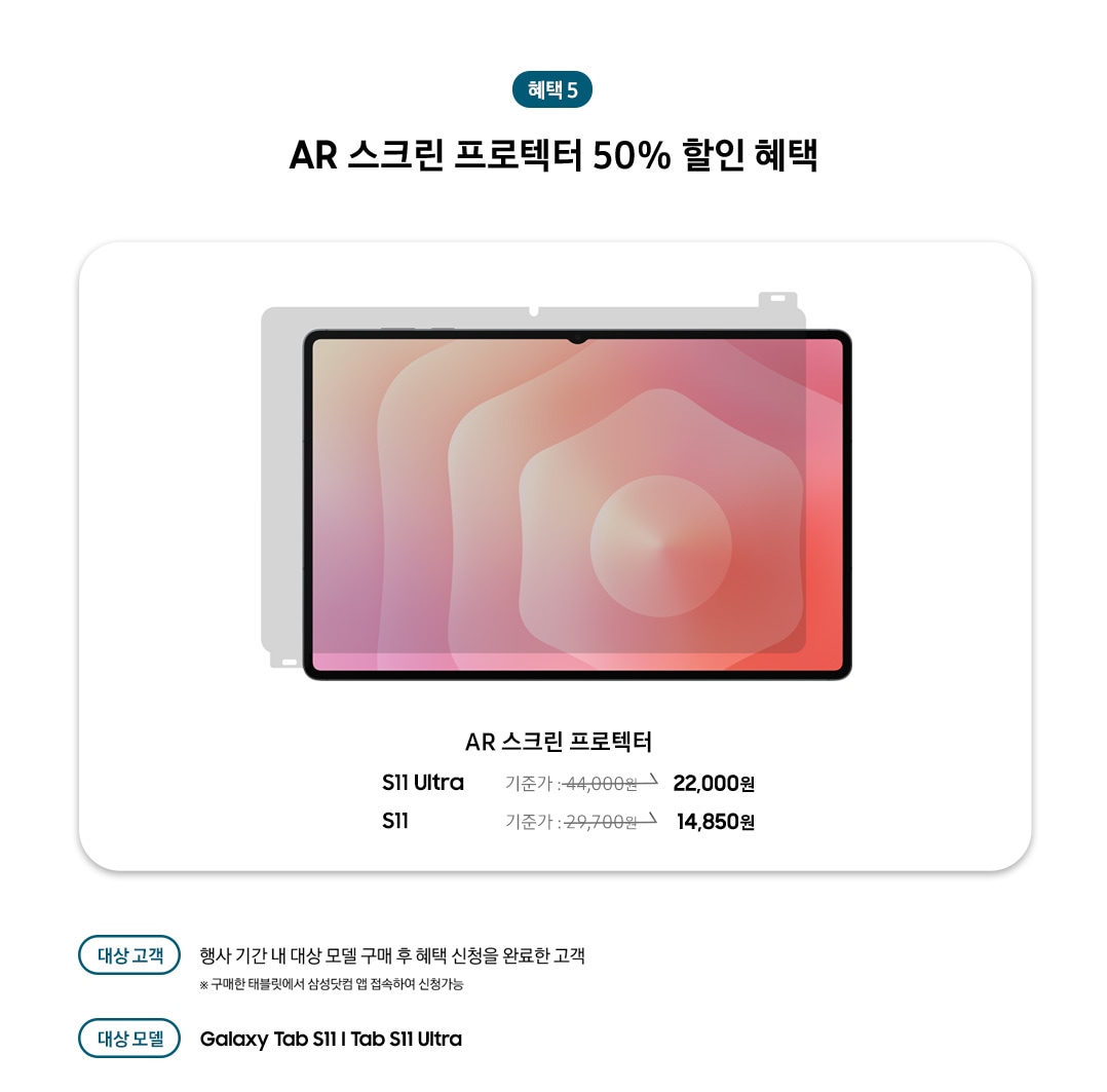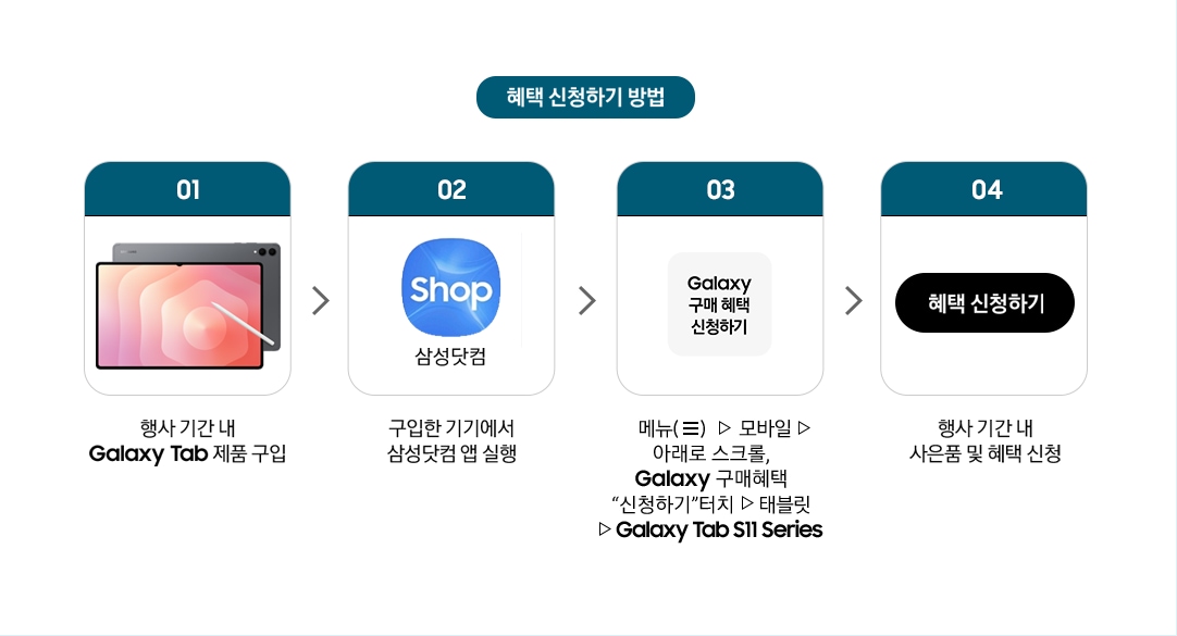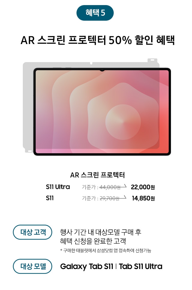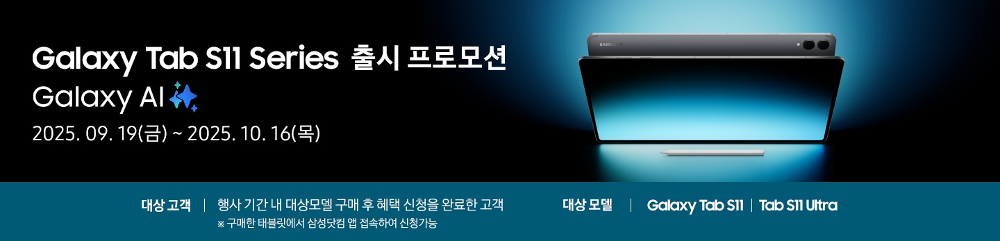 행사기간 : 2025.9.19 ~ 2025.10.16 대상 고객 : 행사 기간 내 대상 모델 구매 고객 *구매한 태블릿으로 삼성닷컴 앱 접속하여 신청가능