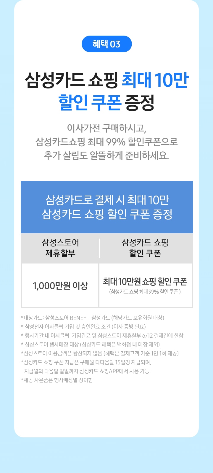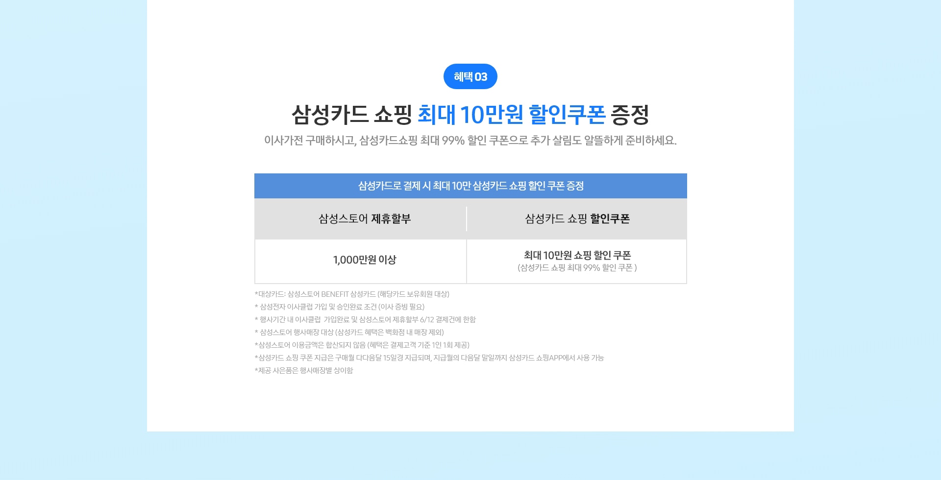| 삼성카드로 결제 시 최대 10만 삼성카드 쇼핑 할인 쿠폰 증정 | |