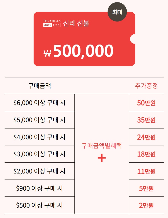 | $6,000 이상 구매 시 | 구매금액별혜택 + | 50만원 |