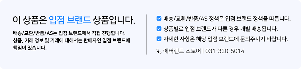 배송/교환/반품/AS는 입점 브랜드에서 직접 진행합니다. 상품, 거래 정보 및 거래에 대해서는 판매자인 입점 브랜드에 책임이 있습니다.