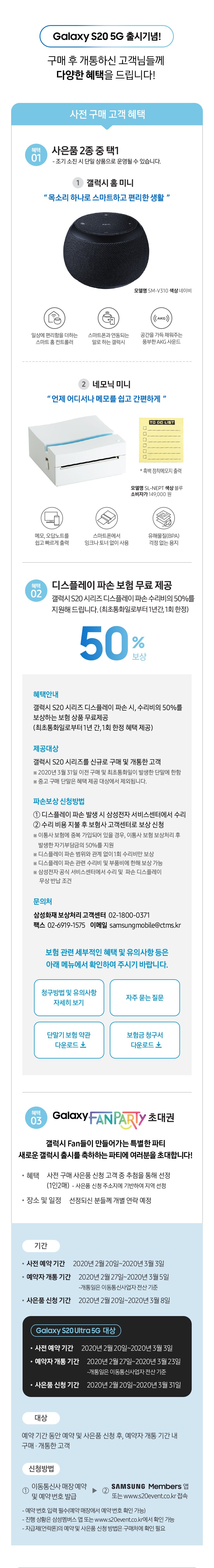 - 갤럭시 S20 시리즈 디스플레이 파손 시, 수리비의 50%를 보상하는 보험 상품 무료제공 (최초통화일로부터 1년 간, 1회 한정 혜택 제공)