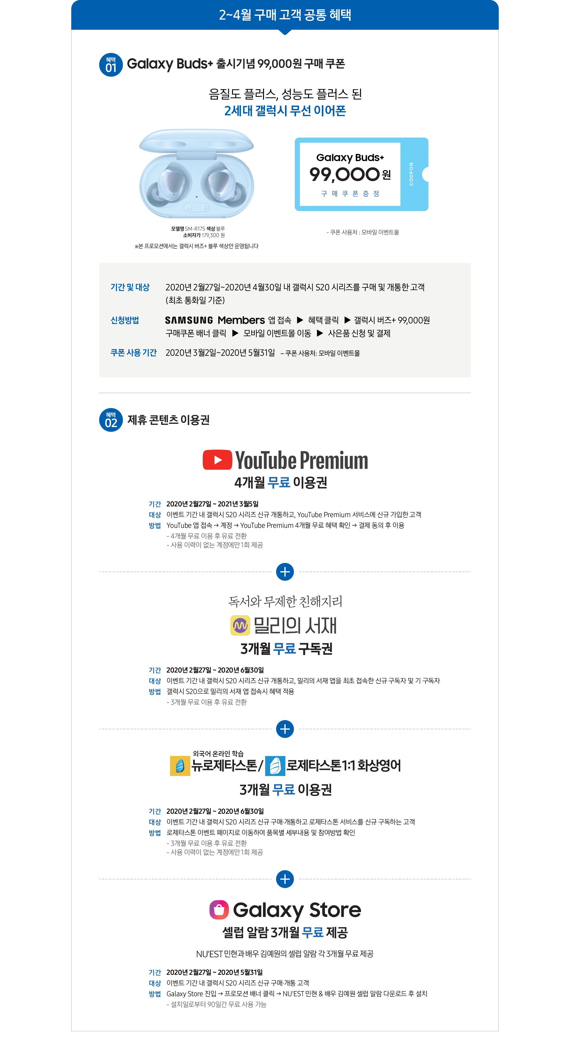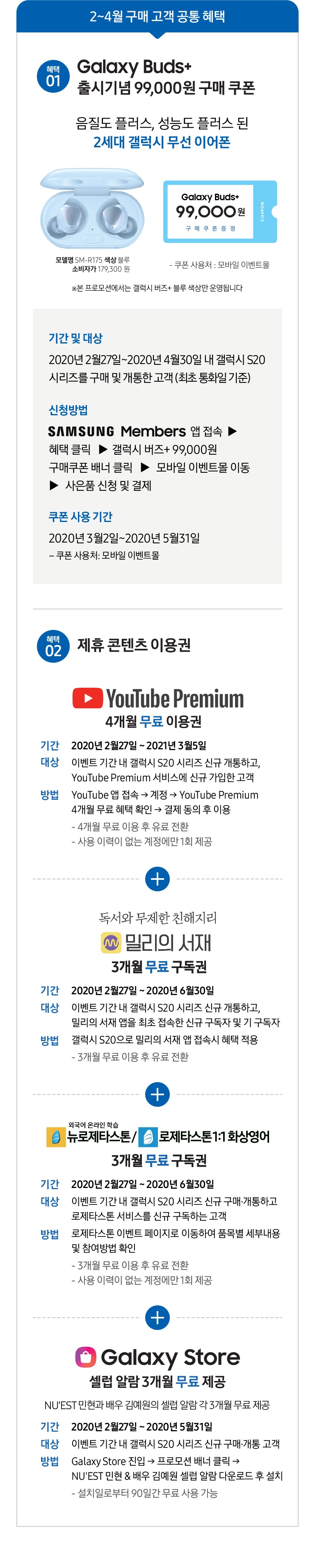 - 이벤트 기간 내 갤럭시 S20 시리즈 신규 개통하고, 밀리의 서재 앱을 최초 접속한 신규 구독자 및 기 구독자