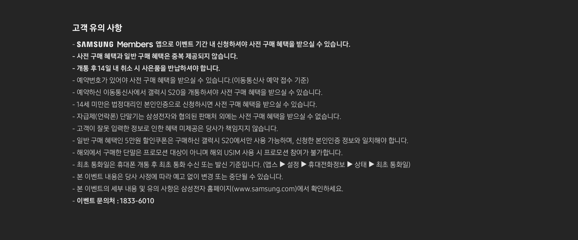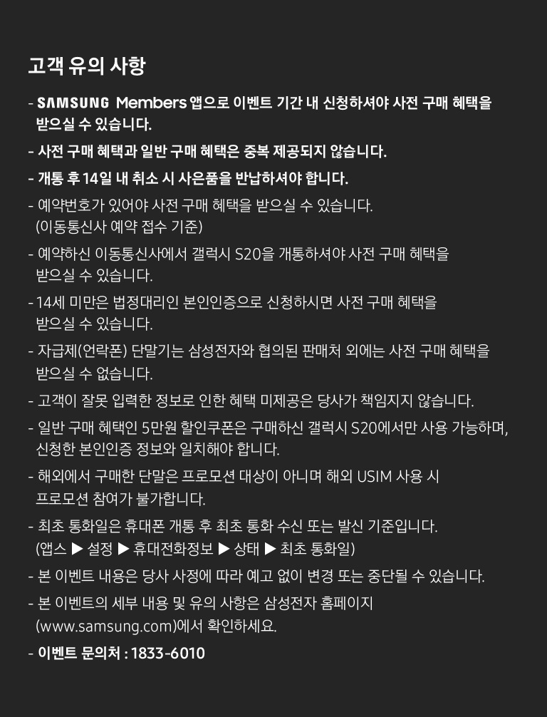 - 일반 구매 혜택인 5만원 할인쿠폰은 구매하신 갤럭시 S20에서만 사용 가능하며, 신청한 본인인증 정보와 일치해야 합니다.