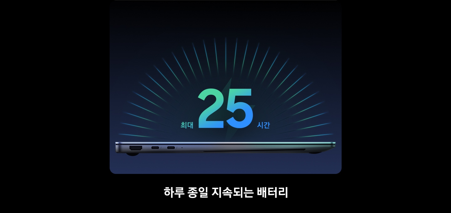 * 배터리 사용 시간은 최초 출하 상태 제품을 기준으로 당사 실험실에서 측정된 전력을 기반으로 산출한 것입니다. 자세한 설명은 https://www.samsung.com/sec/support/battery_pc을 참조하시기 바랍니다. 단, Galaxy Book S 제품은 https://www.samsung.com/sec/support/battery 에서 참조해 주시기 바랍니다.