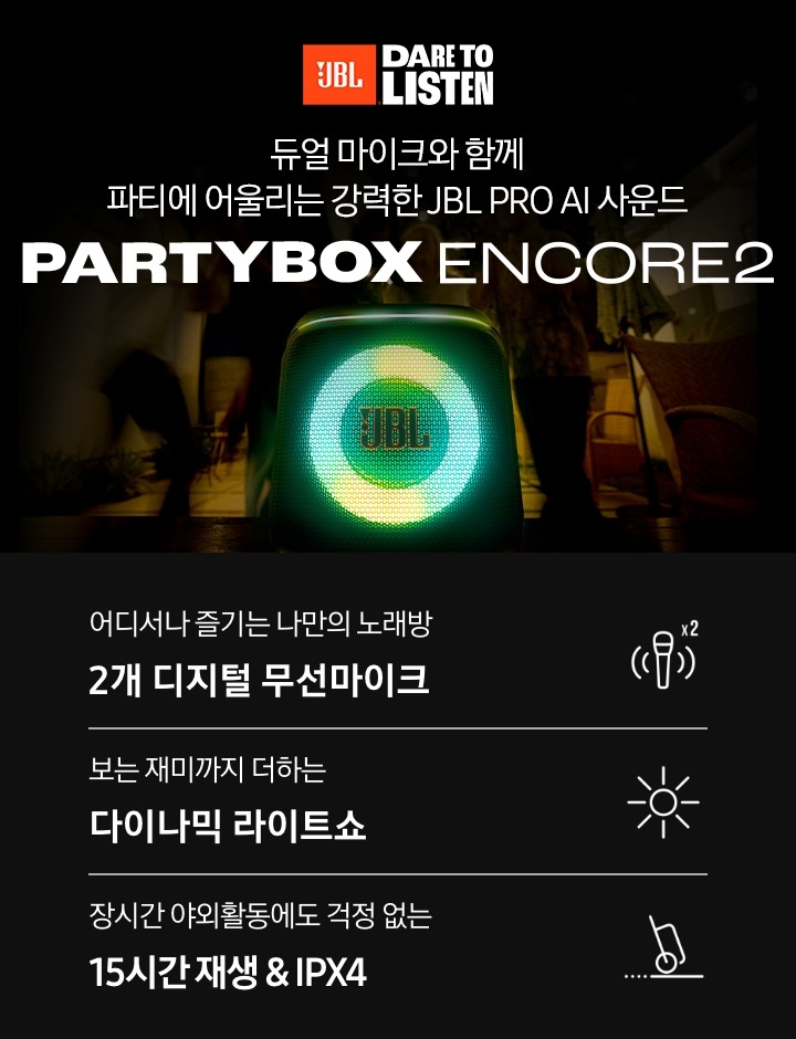 JBL PartyBox Encore 2는 IPX4 방수 등급으로