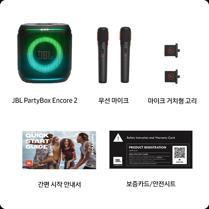 JBL PartyBox Encore 2 본체 1대, 무선 마이크 2개, 마이크 거치형 고리 2개,