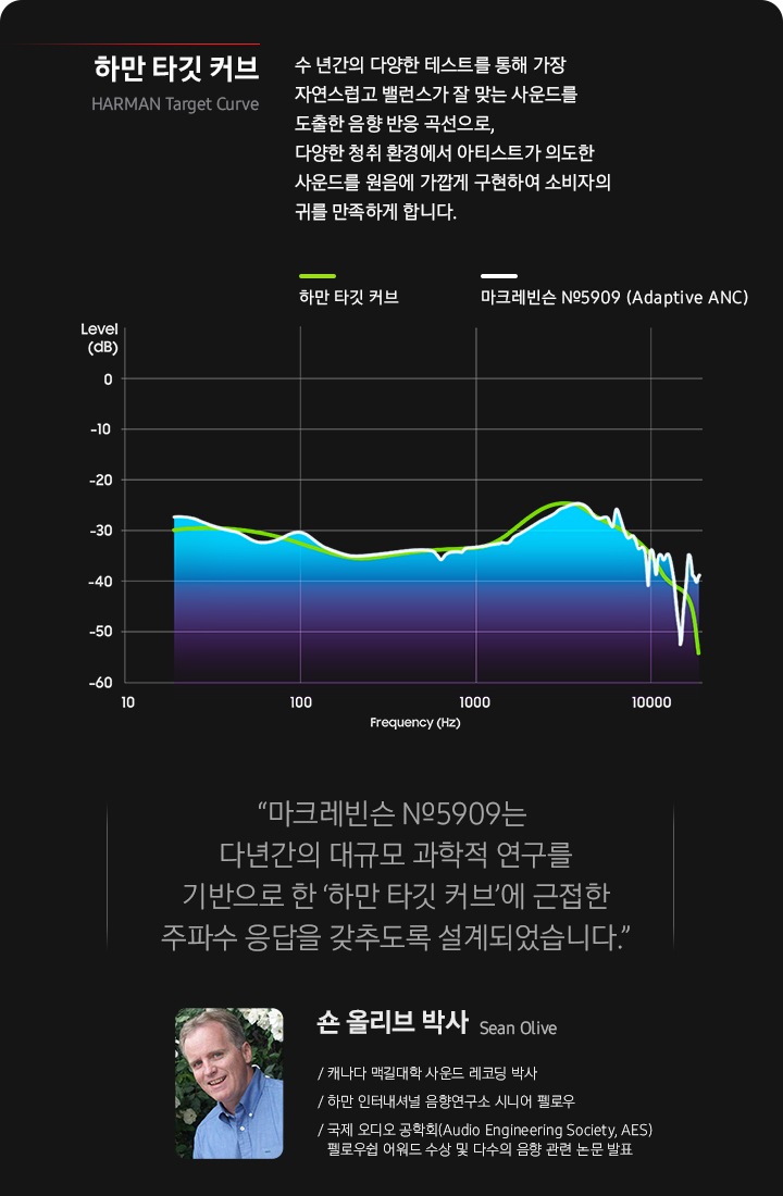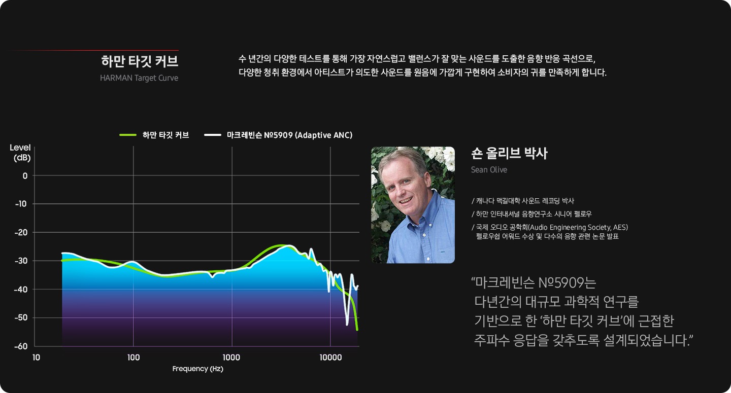 * '하만 타깃 커브' 측정 데이터는 자사 실험치 결과로 실사용 환경에 따라 달라질 수 있습니다. (Measured by Dr. Sean Olive on Jan, 2022).