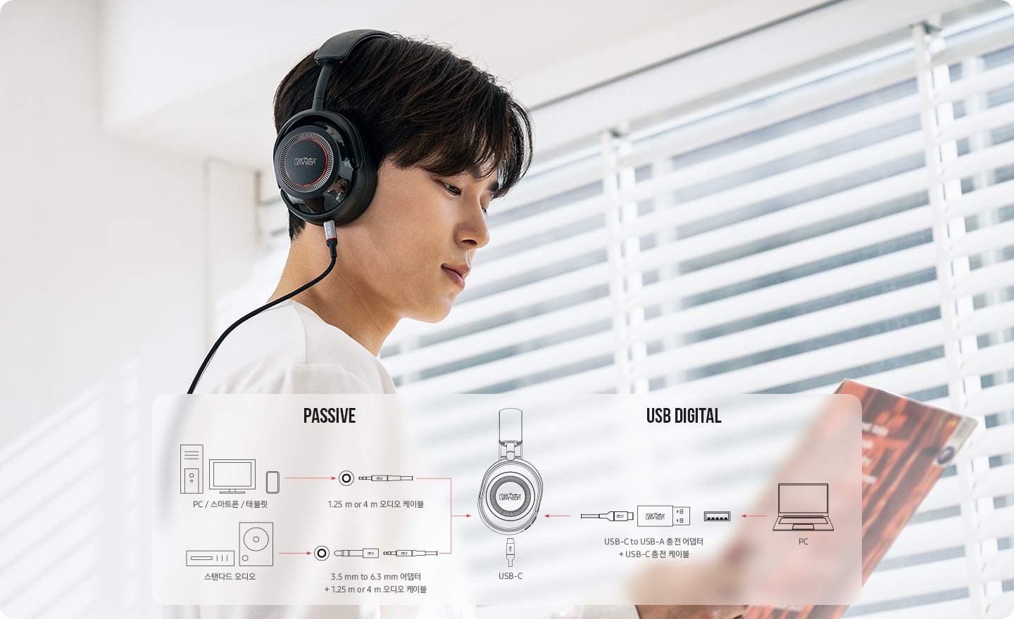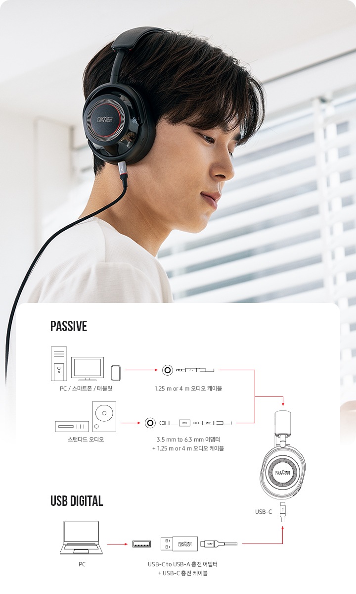 * 오디오 케이블을 통한 수동(Passive) 모드 전환 시, 헤드폰의 전원이 꺼지며 마이크 및 버튼이 비활성화되어 일부 기능 및 앱 사용이 제한됩니다.