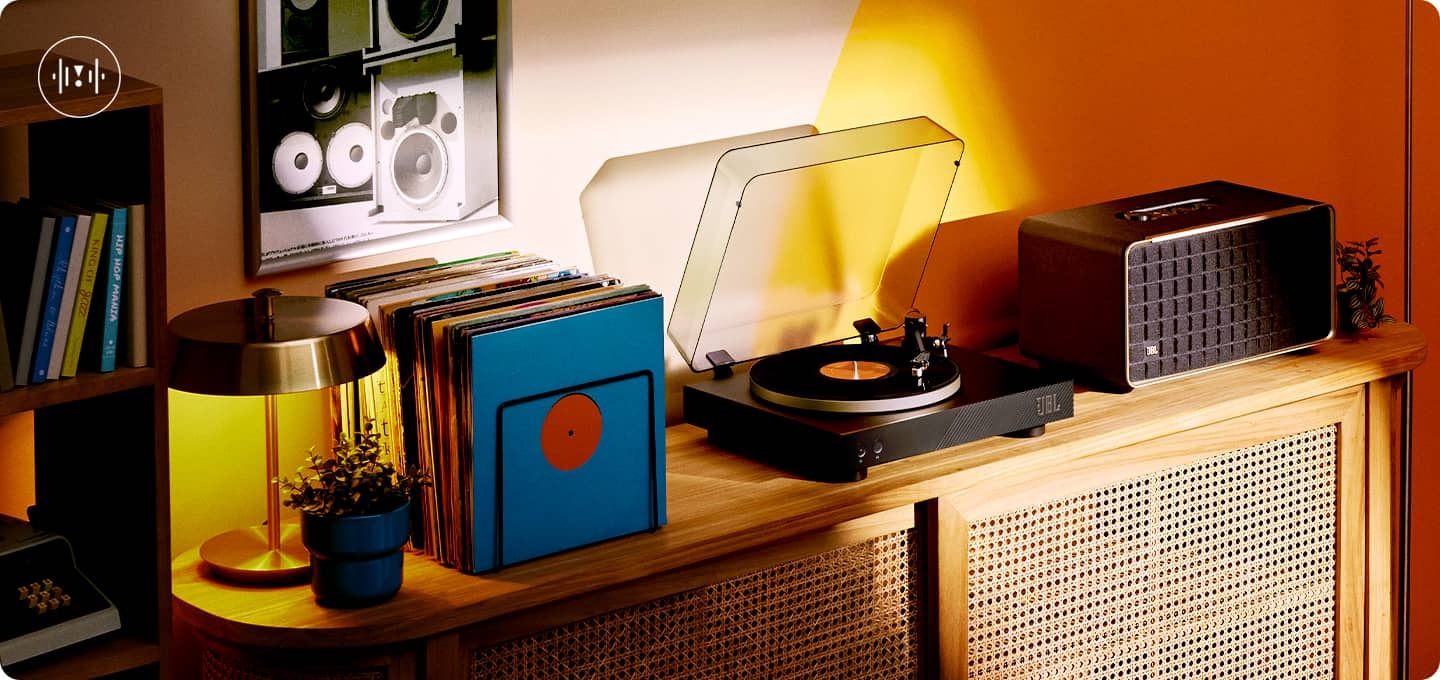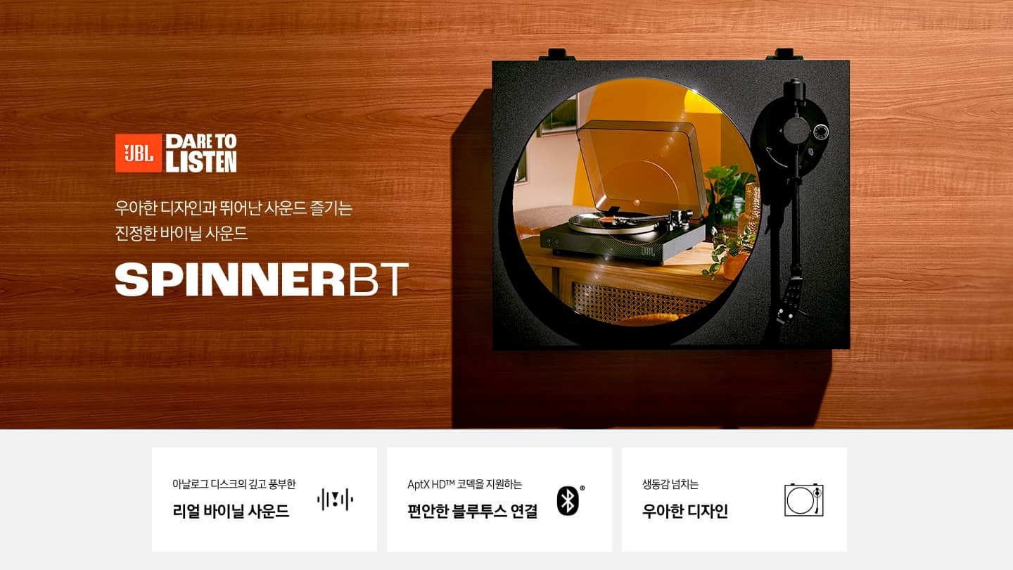 JBL 스피너 BT 턴테이블은 알루미늄 플래터와 톤암, JBL 오렌지·골드 컬러로 포인트를 준 블랙 MDF 받침대,