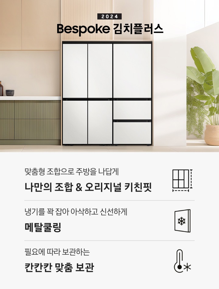 * 1,035 L는 Bespoke 냉장고 키친핏 4도어 RF60C9011AP, 김치플러스 키친핏 4도어 RQ42C94B2AP 페어 설치 시 용량입니다.