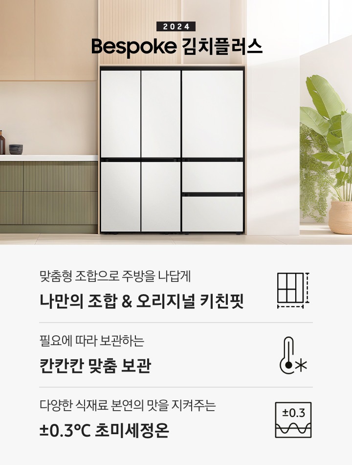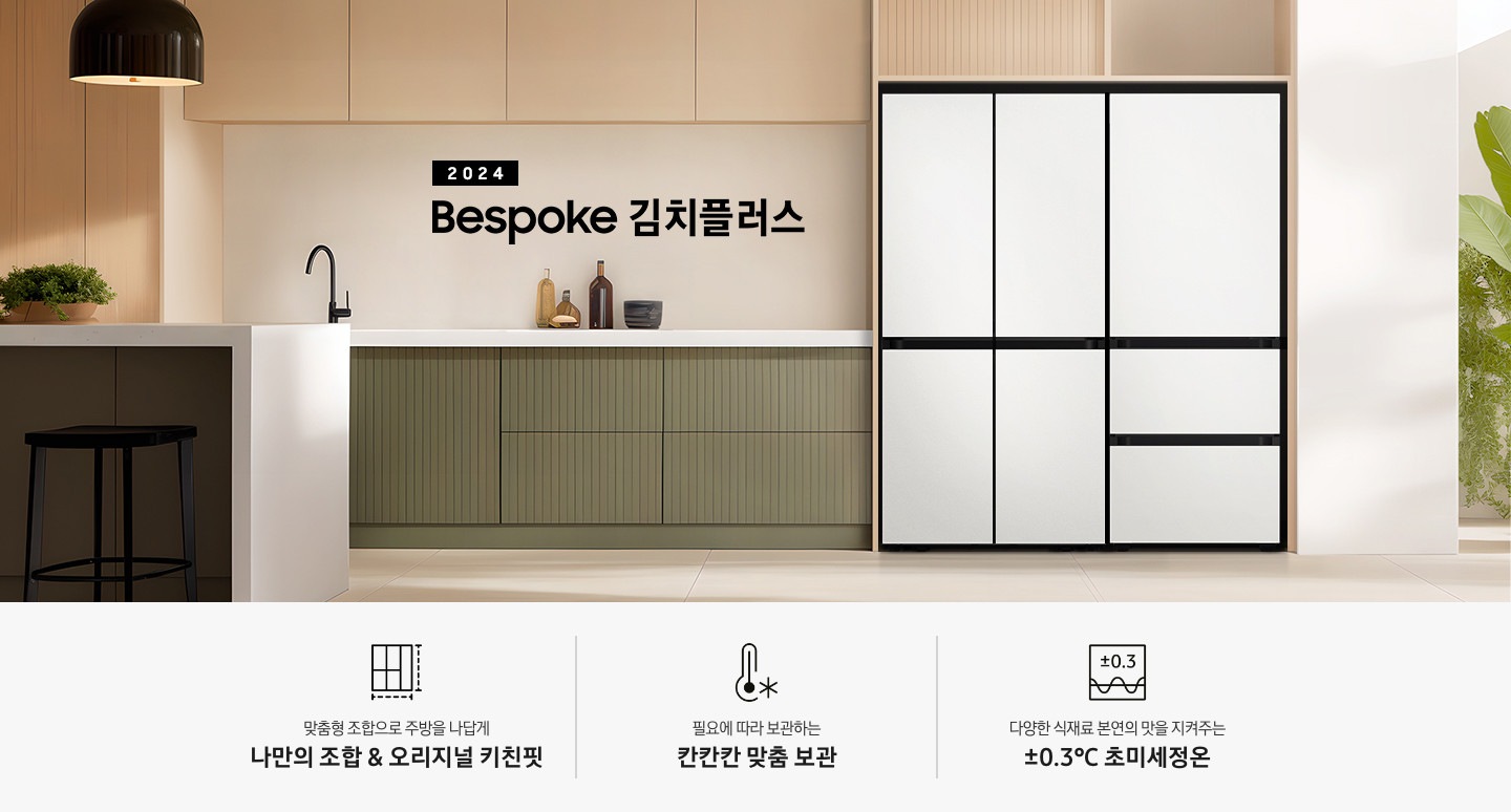 * 1,035 L는 Bespoke 냉장고 키친핏 4도어 RF60C9011AP, 김치플러스 키친핏 4도어 RQ42C94B2AP 페어 설치 시 용량입니다.